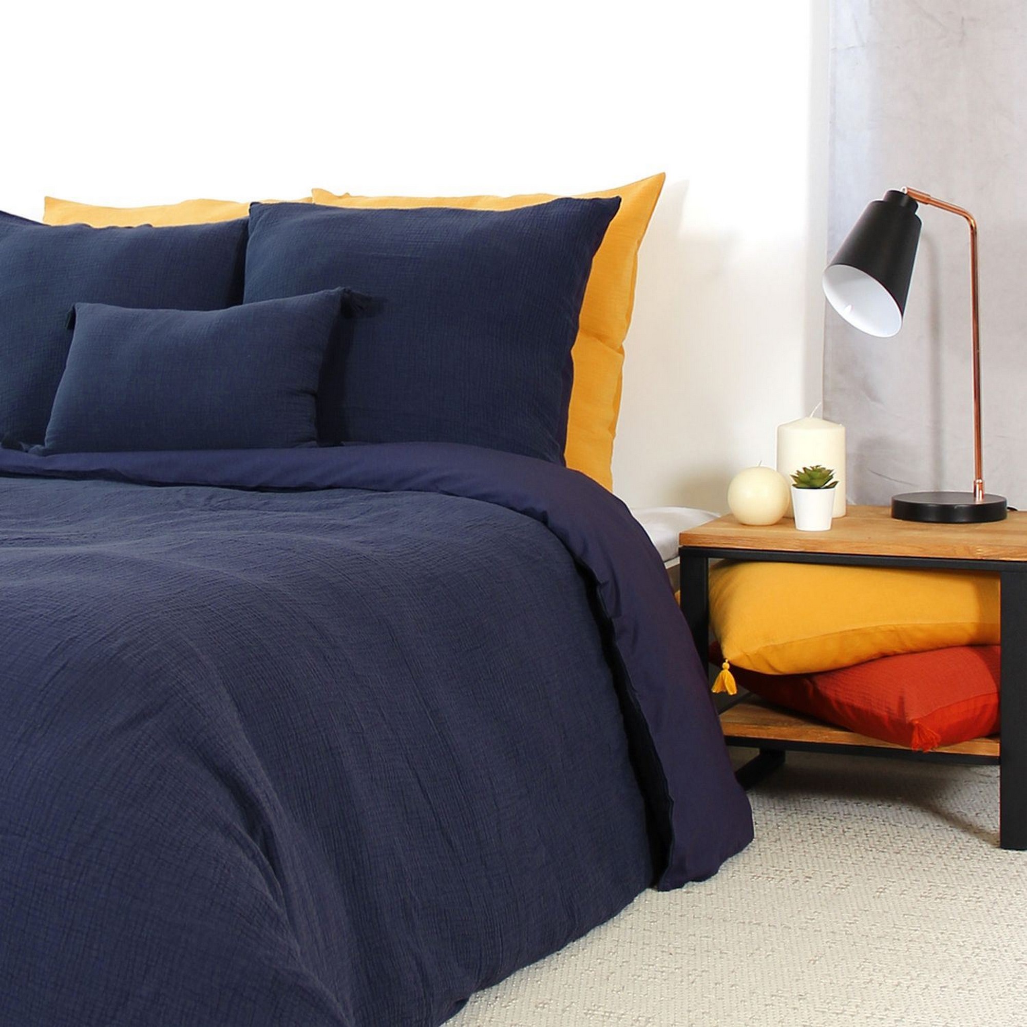 | Libellé | Housse de couette 240x260 + 2 taies d'oreiller 63x63 cm Gaze de Coton Marine |
