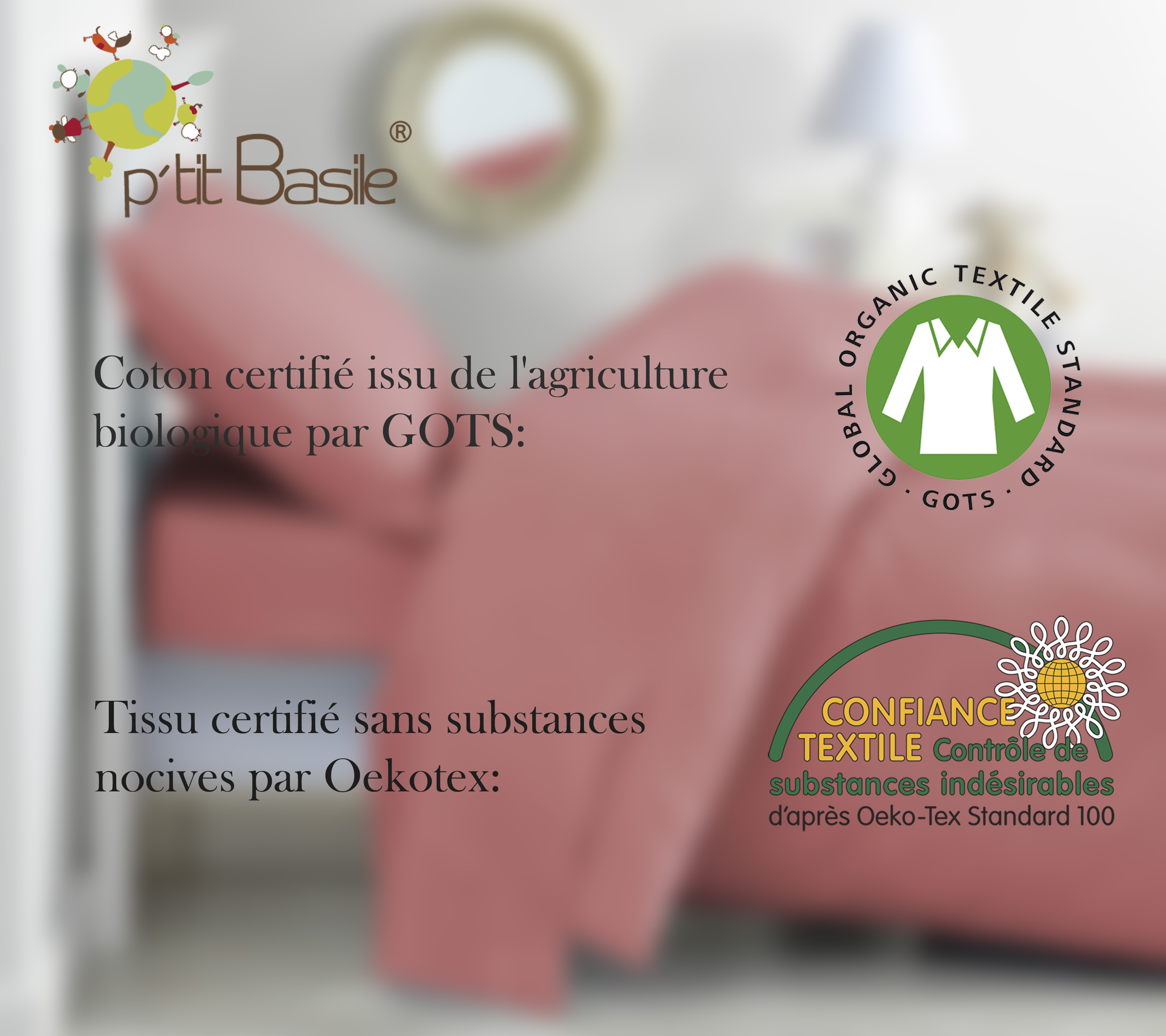 Plus produit Coton issu de l'agriculture biologique cultivé sans pesticides ni engrais chimiques et certifié oeko-tex sans substances nocives pour votre enfant