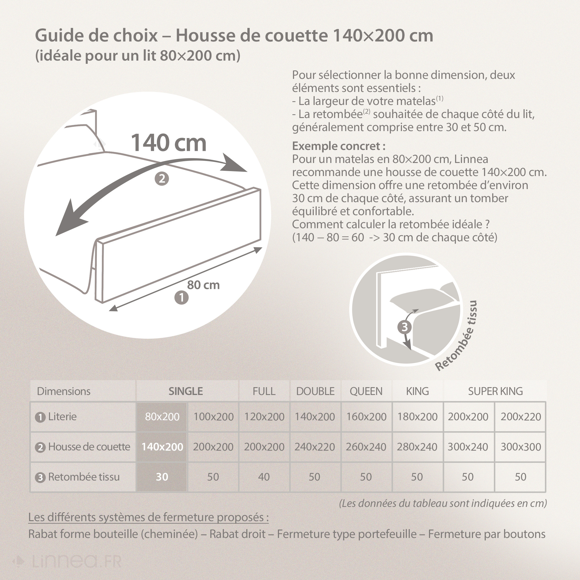Le choix de la taille de votre housse de couette dépend principalement des dimensions de votre lit et de vos préférences en matière de confort. Une housse de couette adaptée garantit un sommeil paisible et une belle harmonie dans la chambre.La housse de couette 140x200 cm est parfaite pour un lit simple de 90x190 cm ou 90x200 cm, la housse de couette 140x200 cm offre un tombé suffisant pour un confort optimal. Idéale pour une personne, elle permet de bien envelopper le dormeur tout en s'adaptant aux lits de petites dimensions.