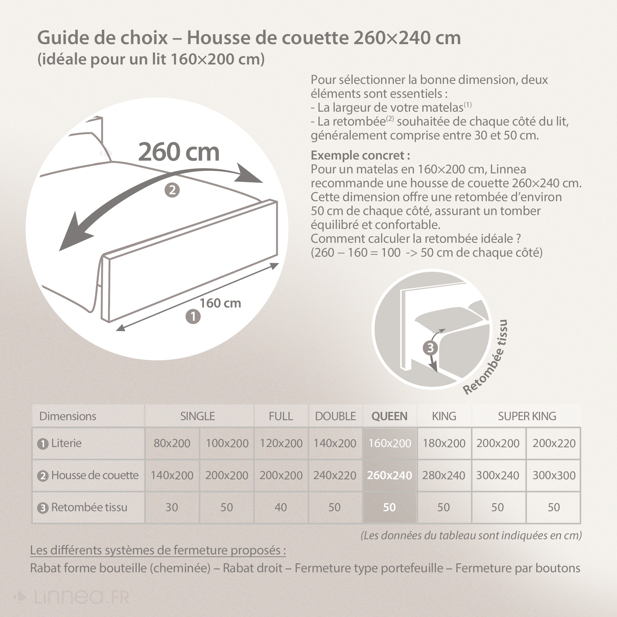 Le choix de la taille de votre housse de couette dépend principalement des dimensions de votre lit et de vos préférences en matière de confort. Une housse de couette adaptée garantit un sommeil paisible et une belle harmonie dans la chambre.La housse de couette 260x240 cm est idéale pour un lit Queen size de 160x200 cm, cette housse de couette garantit un tombé généreux de chaque côté. Elle offre un confort optimal pour les grands lits, parfaite pour les couples qui apprécient l'espace. Housse de couette qui peut convenir pour un lit King size de 180x200 cm, mais avec une retombée plus petite.