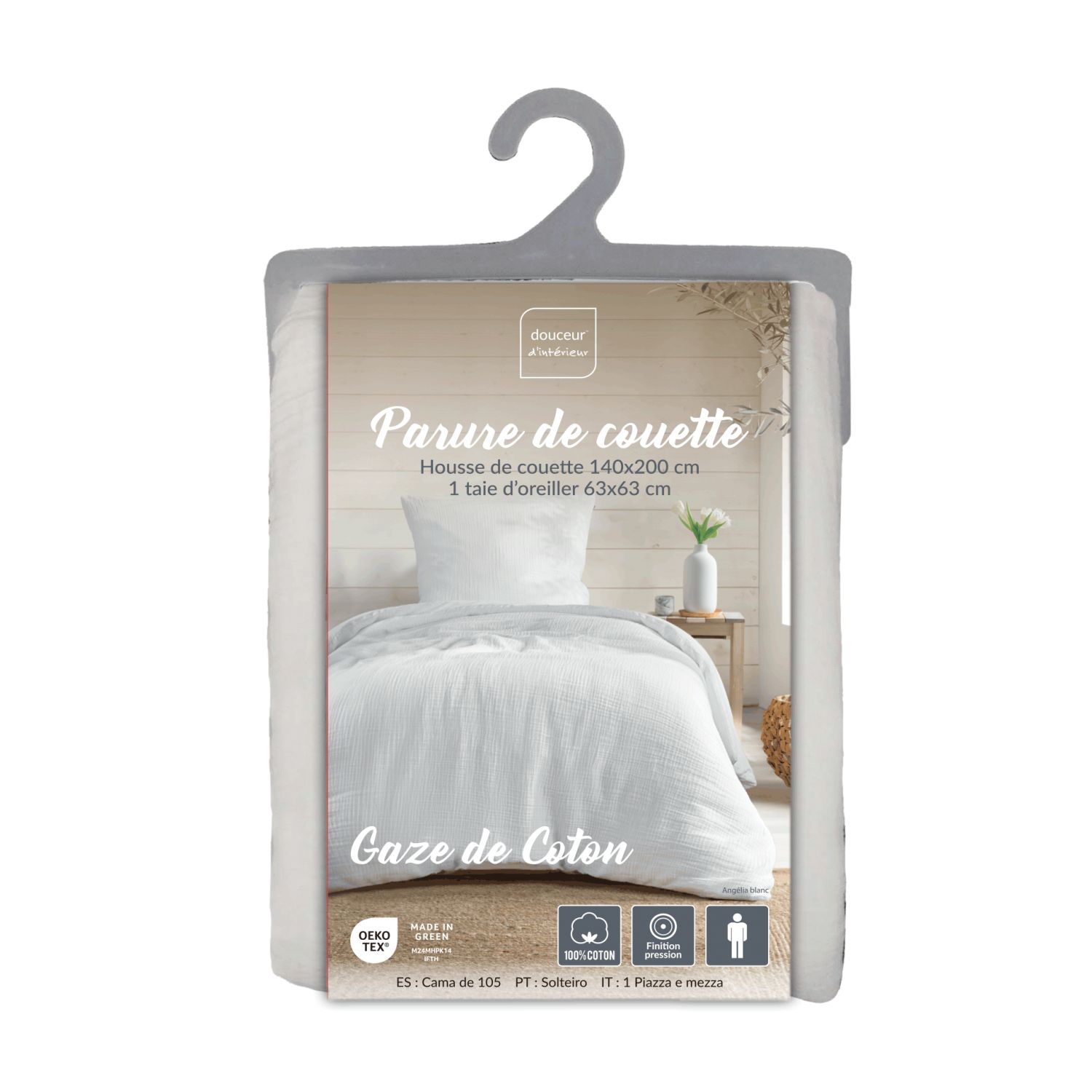 Découvrez la parure de couette idéale : housse 140x200 cm et taie d'oreiller 63x63 cm en gaze de coton.