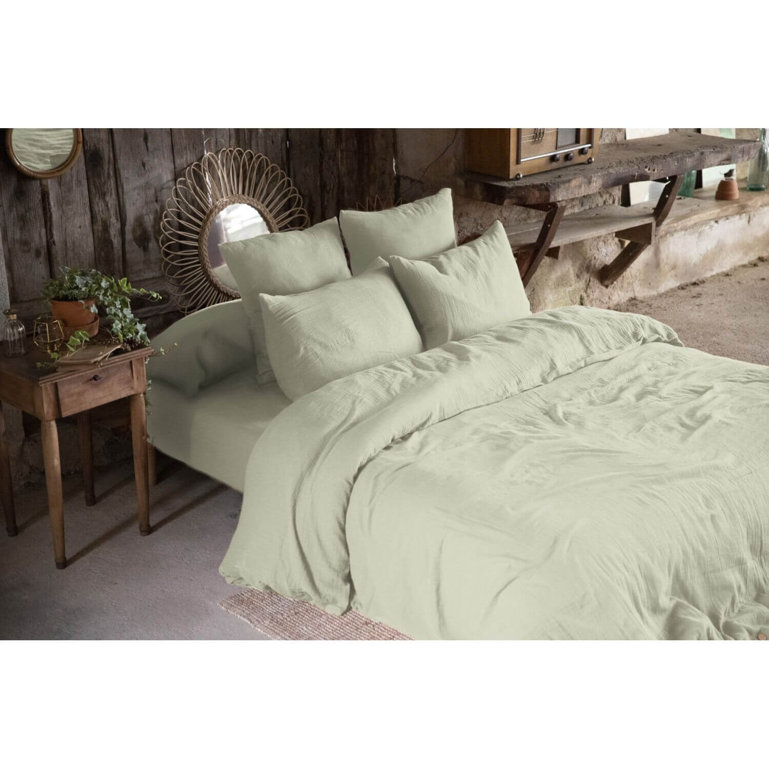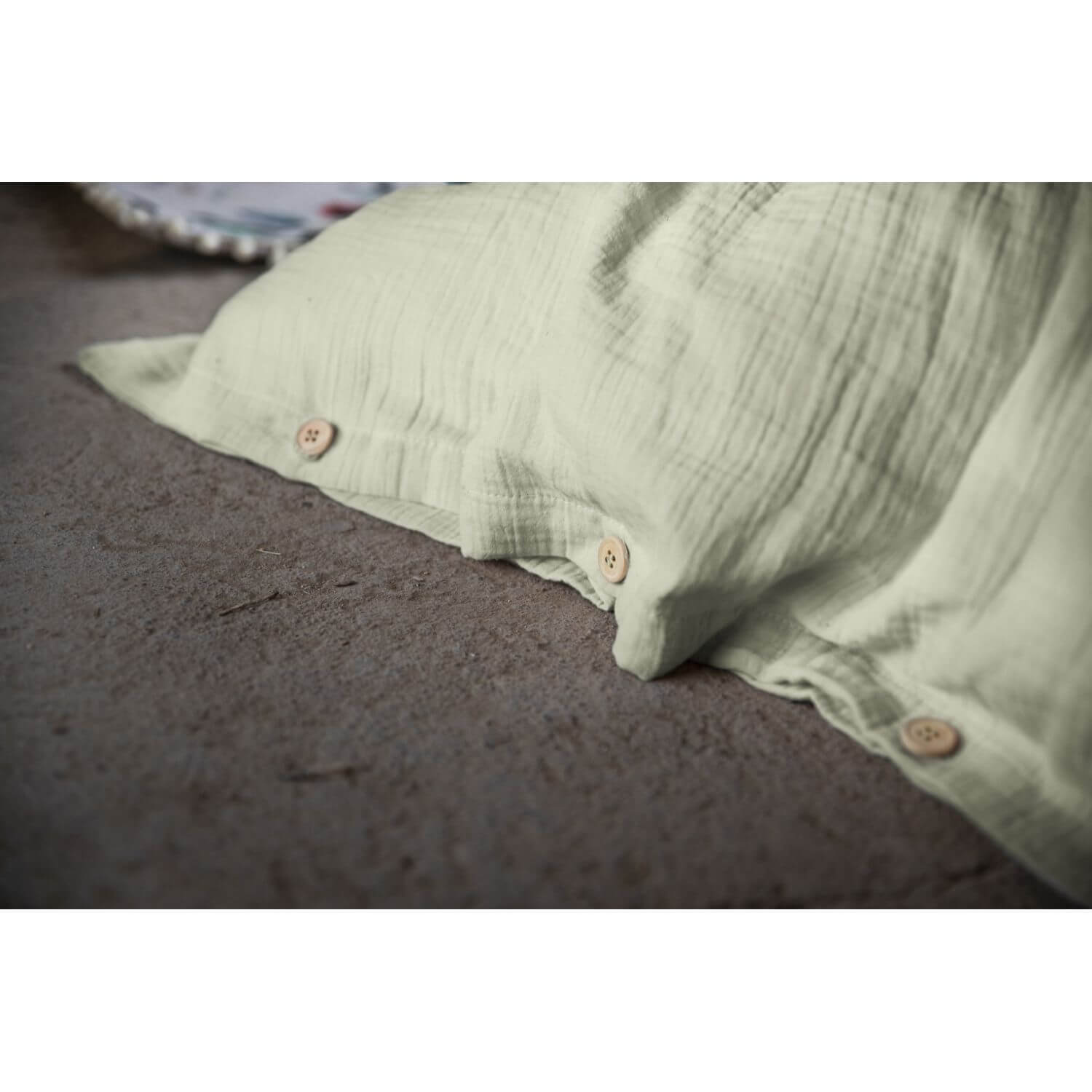 Housse de couette Gaze de Coton 200x200 cm - Ouverture à boutonnières + boutons bois - Composition : 100% Coton - Entretien : Lavable à 60° C (avec des couleurs similaires) - Sèche linge possible