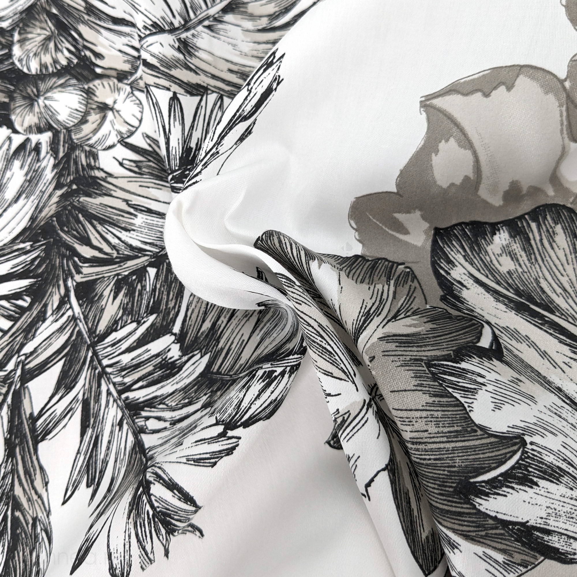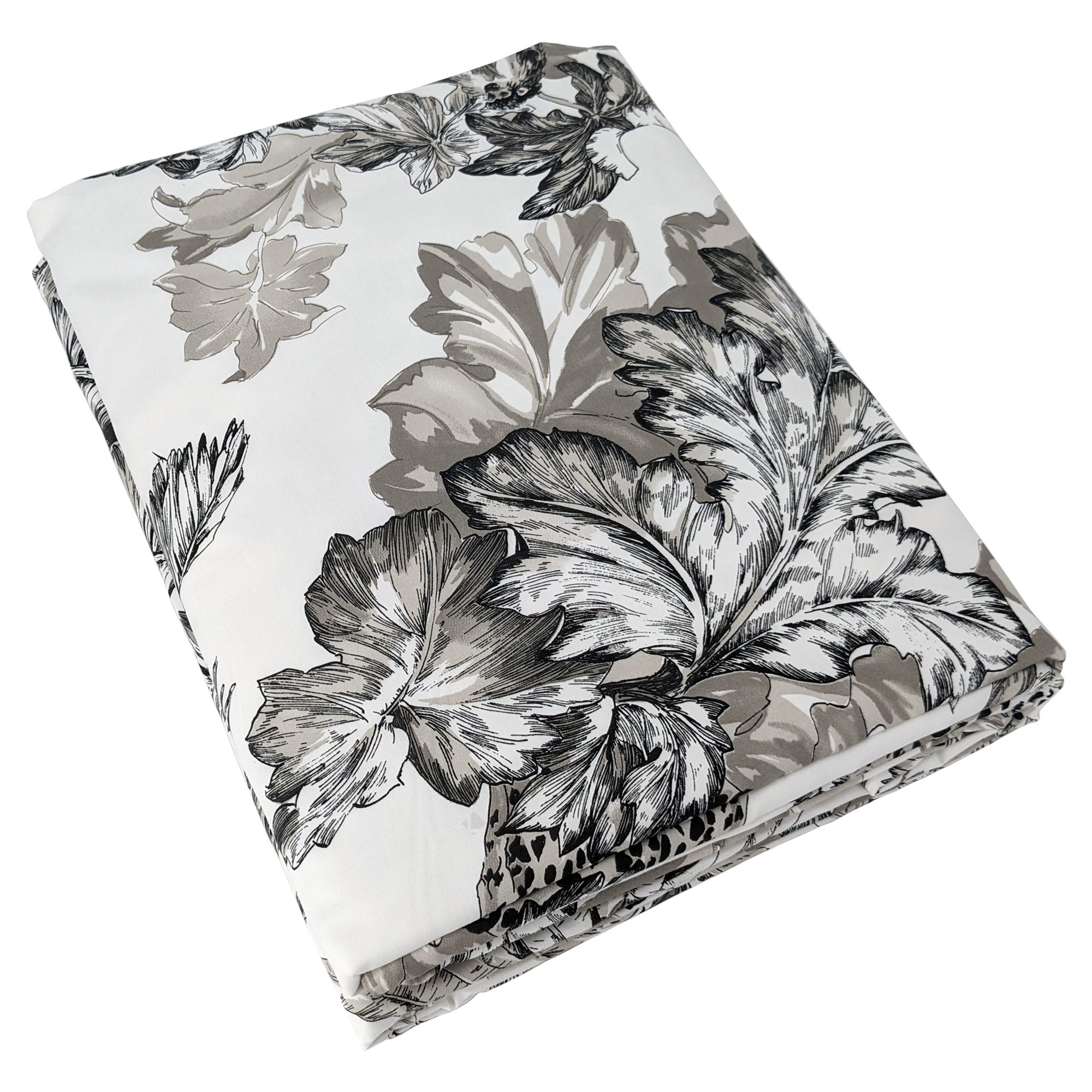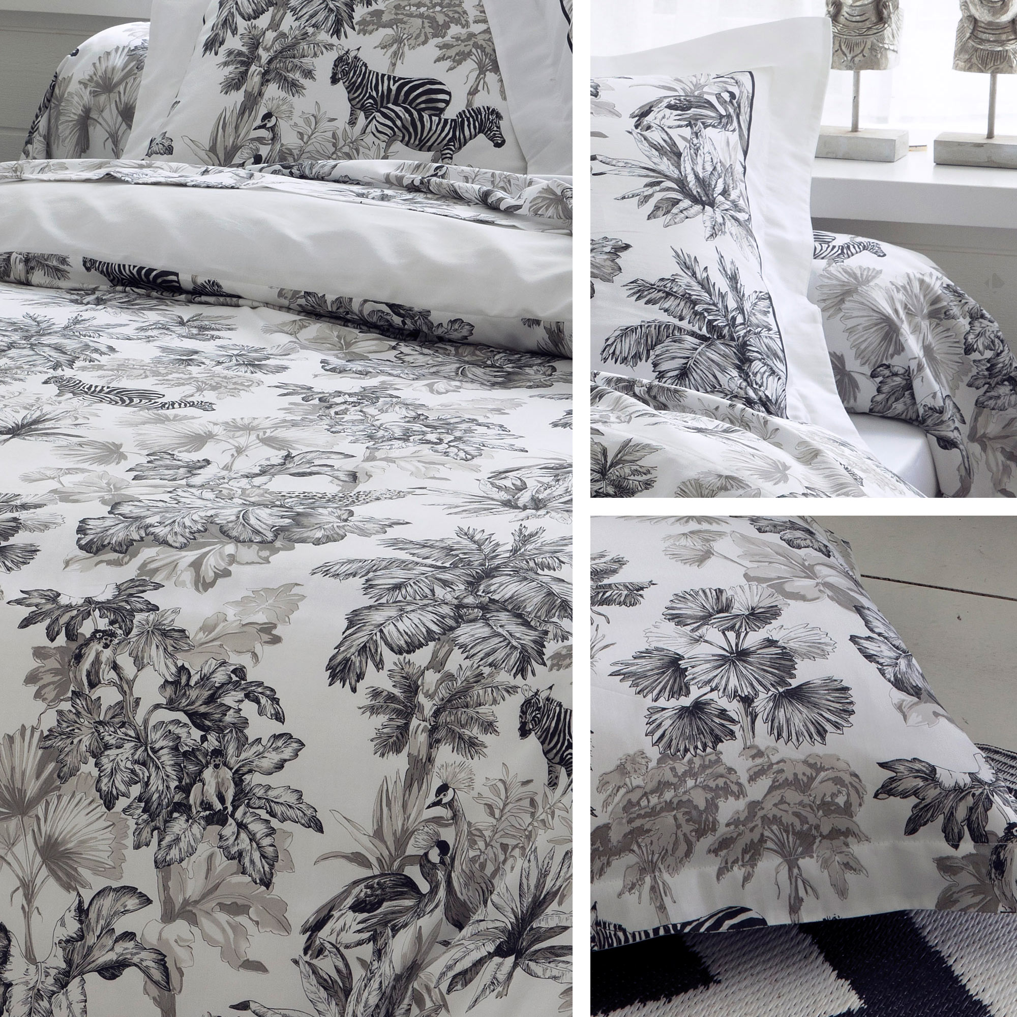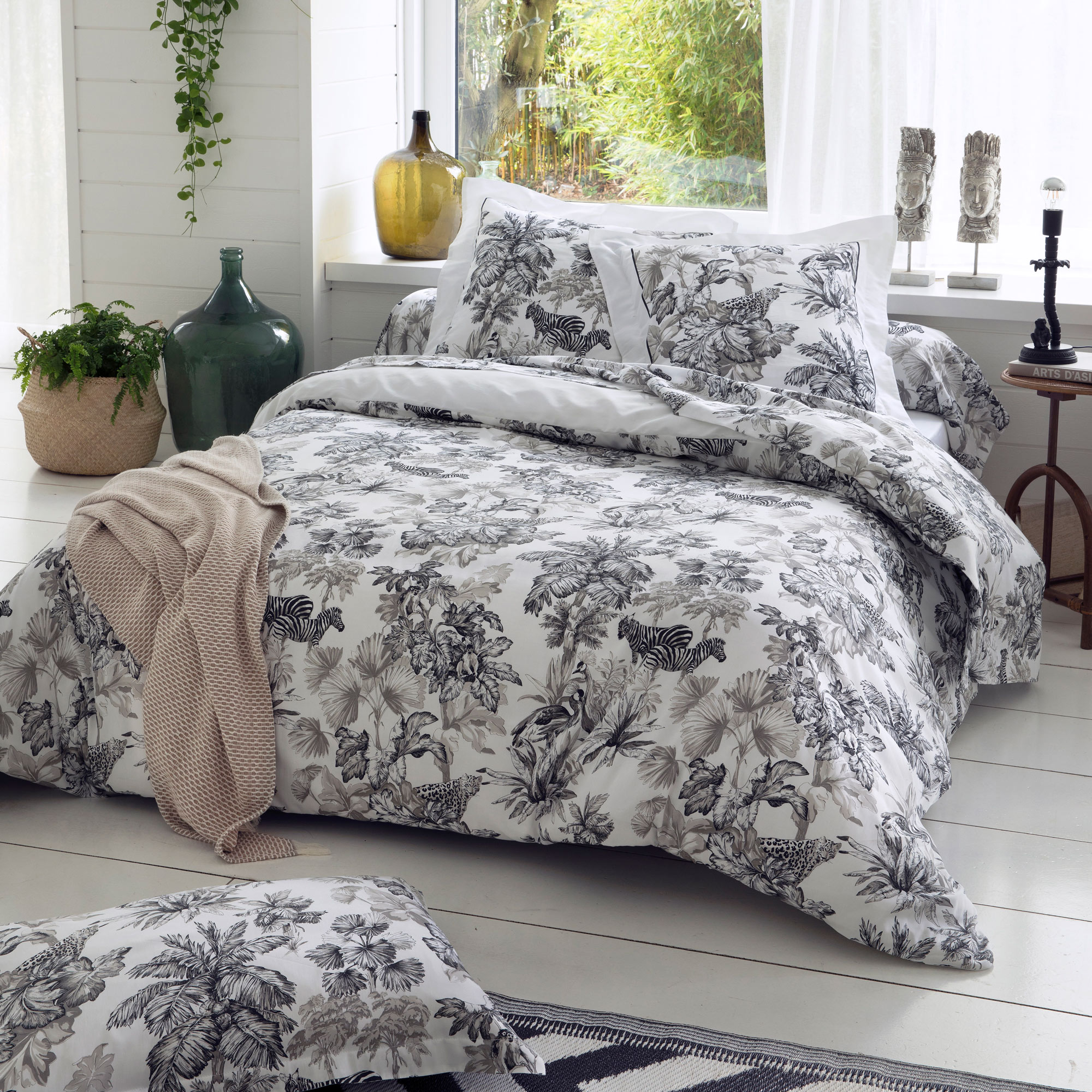 Housse de couette reversible avec une face imprimée motifs de végétation exotique et animaux dessinés à la plume et à l'encre de chine dans des tons de noir sur fond blanc, sur l'autre face uni fond blanc.