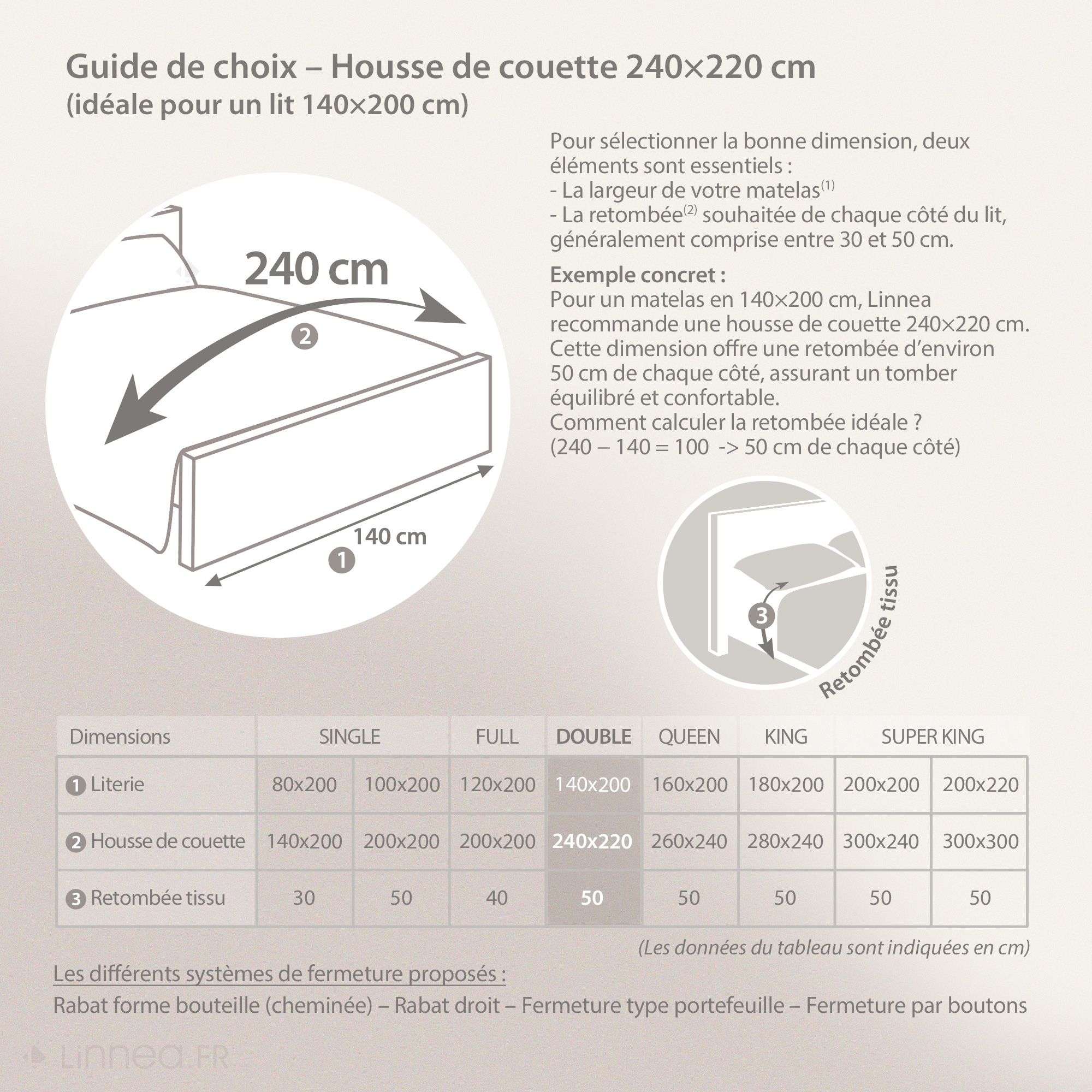 | Tailles (linge de lit) | 240 x 220 cm |