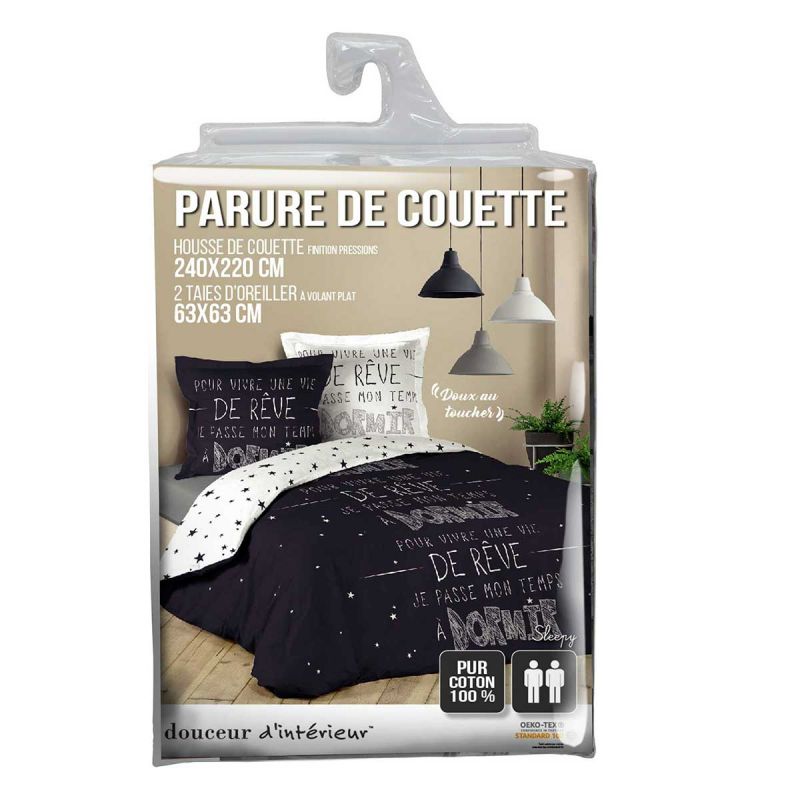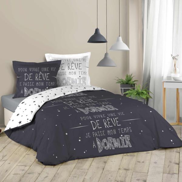 - #DESCRIPTION# Description:Housse de couette avec imprimé d'un texte humoristique pour se coucher avec la bonne humeur, dessin allover, en 100% coton 42 fils.