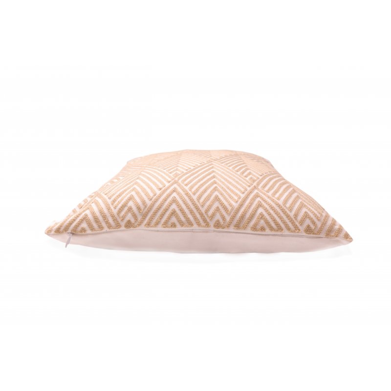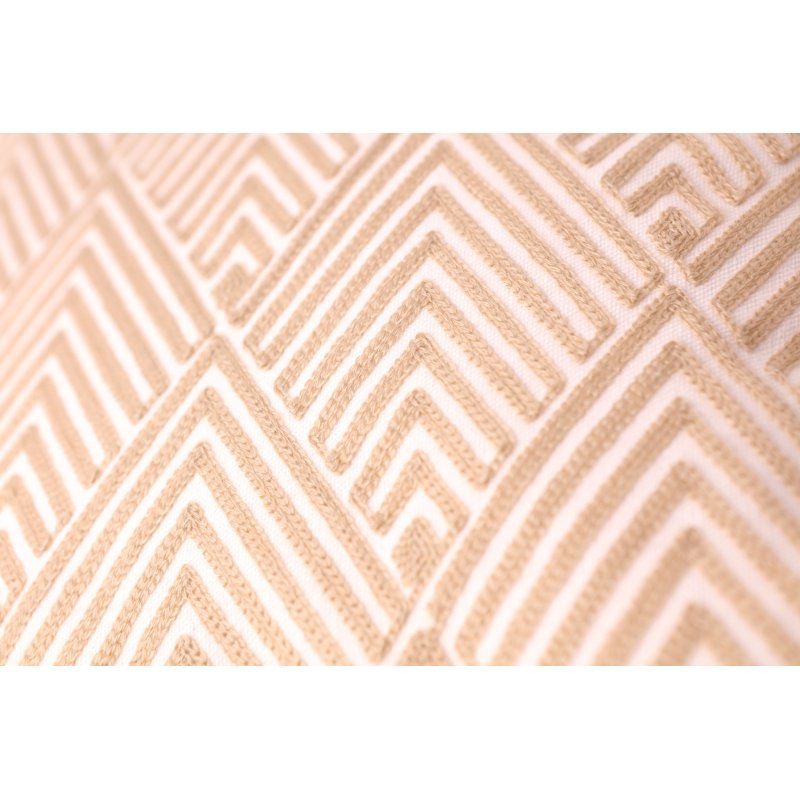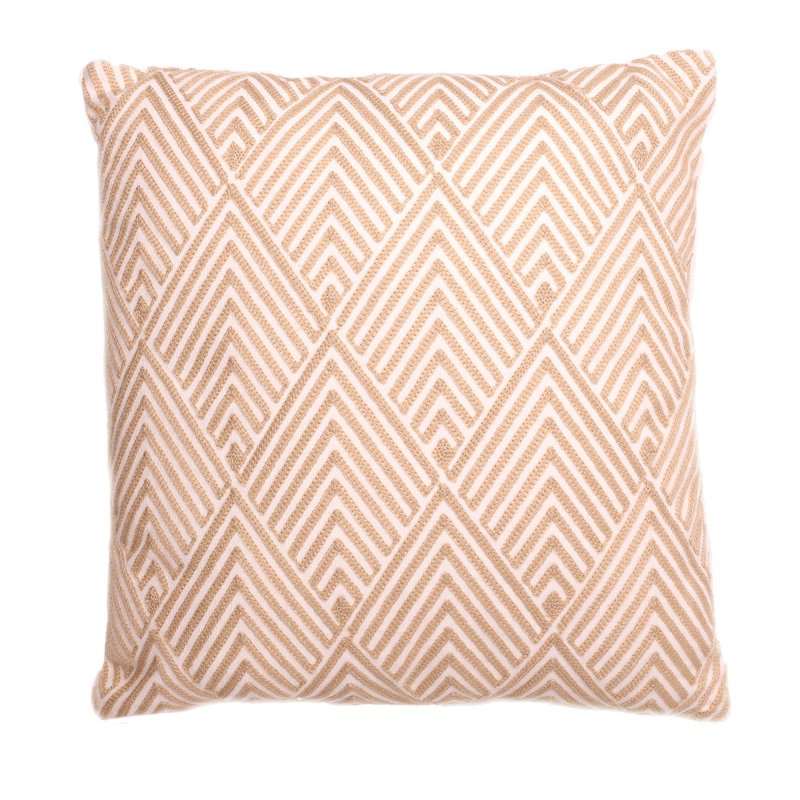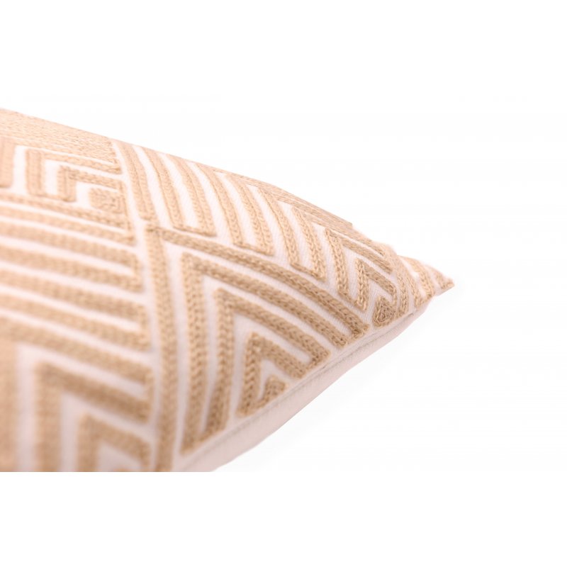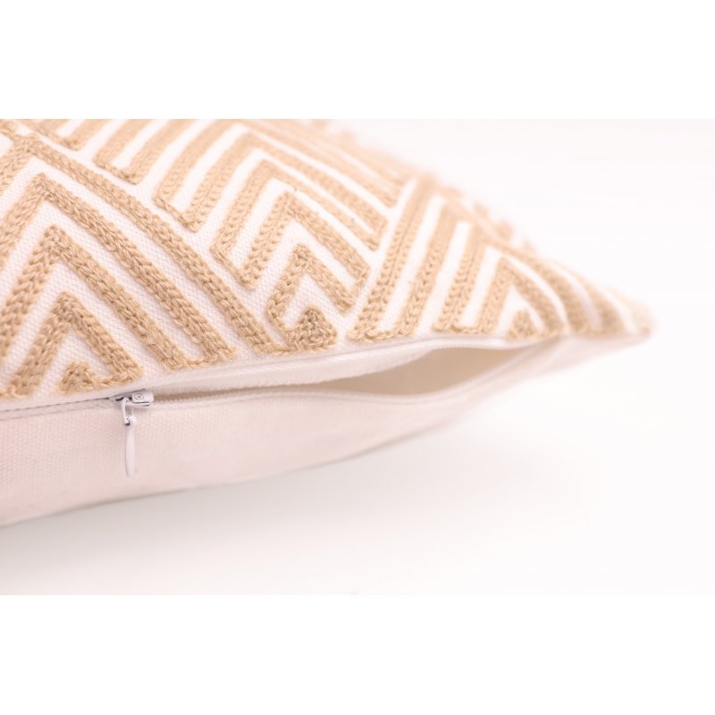Housse de coussin entièrement brodée 100% coton à motifs chevrons en losanges écru sur une face, uni blanc sur l'autre face.