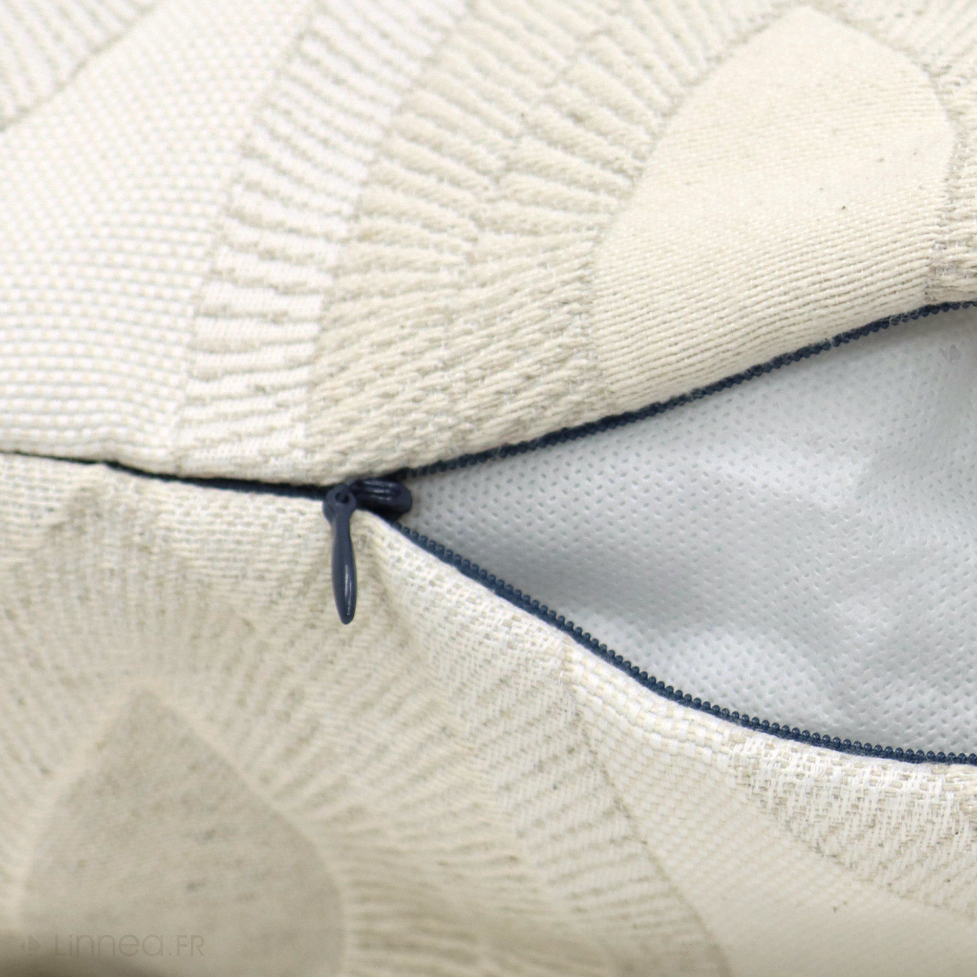 | Plus produit | Housse de coussin dézippable de 80x100 cm collection MAMA Ecru/Lin Faite à la main avec passion et souci du détail, jacquard tissé teint coton, lin et polyester. Housse déhoussable finition fermeture à glissière, livrée sans garnissage intérieur. |