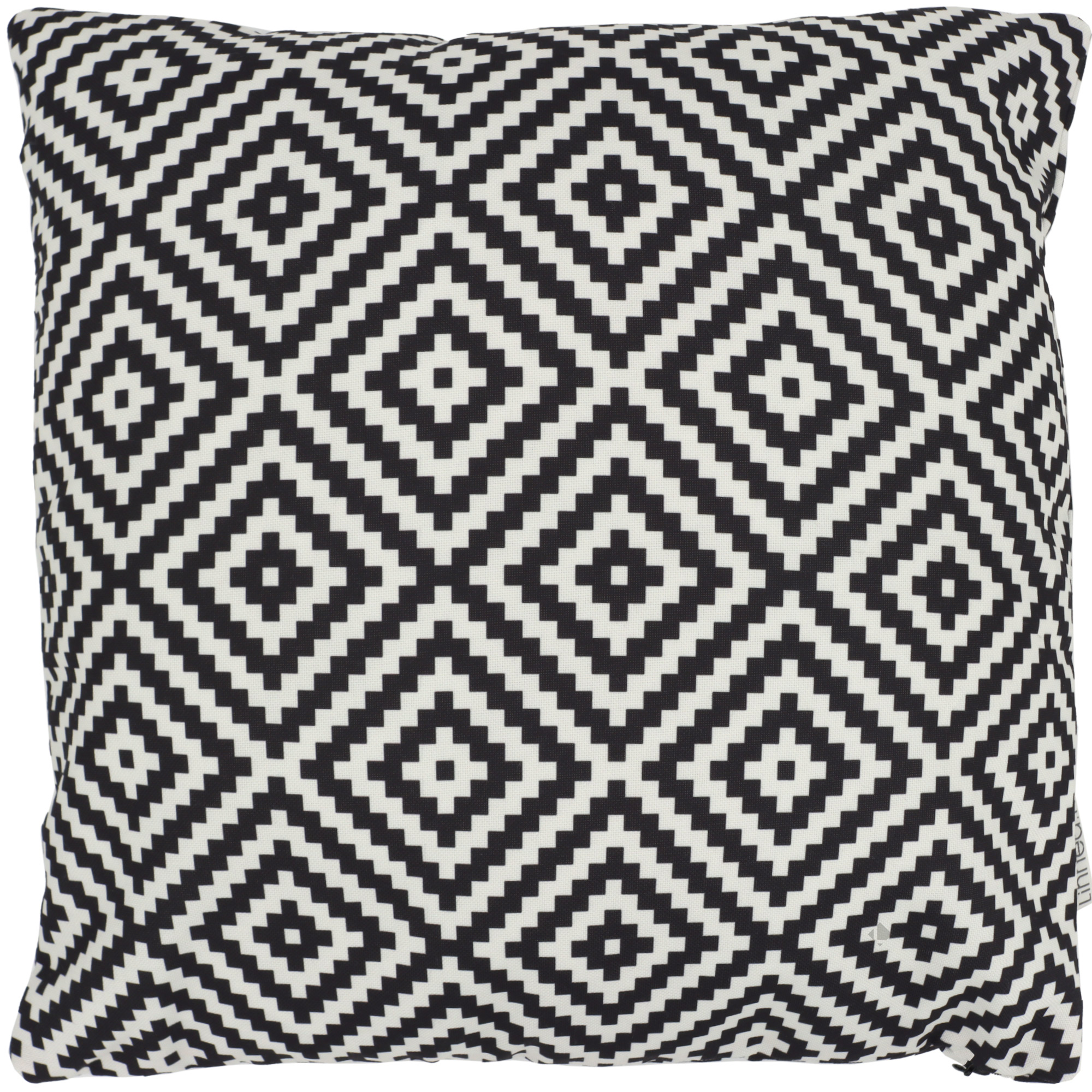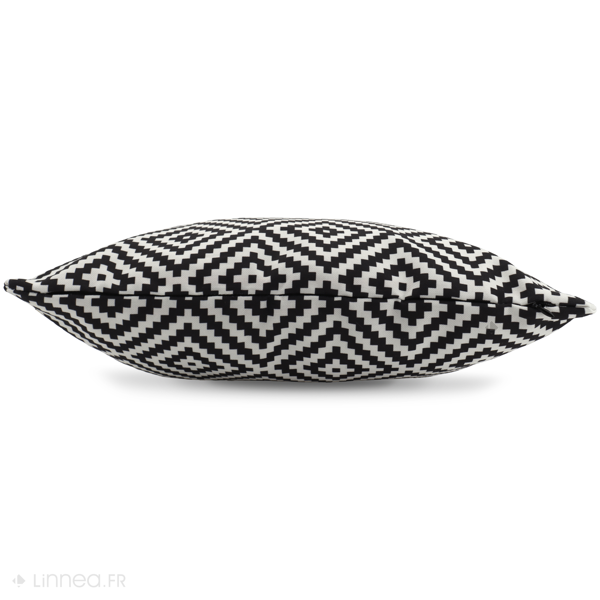 Housse de coussin 50x50 de la collection PANAMA recto/verso tissu polyester déperlant utilisable en extérieur avec un imprimé motif géométriques de losanges imbriqués effet pixels coloris Noir sur fond blanc naturel. Housse de coussin qui sera parfaite pour décorer votre salon de jardin en outdoor avec un esprit graphique et coloré.