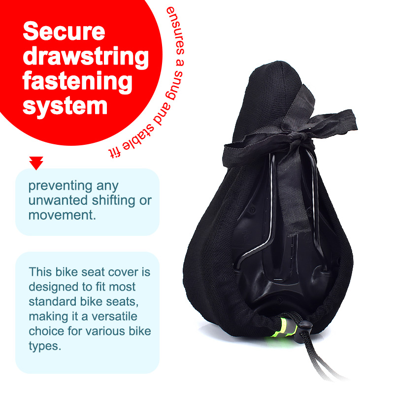 Ajustement universel et installation facile : Cette housse de siège de vélo est conçue pour s'adapter à la plupart des sièges de vélo standard, ce qui en fait un choix polyvalent pour différents types de vélos. Le système de fixation sécurisé par cordon de serrage assure un ajustement serré et stable, empêchant tout déplacement ou mouvement indésirable.
