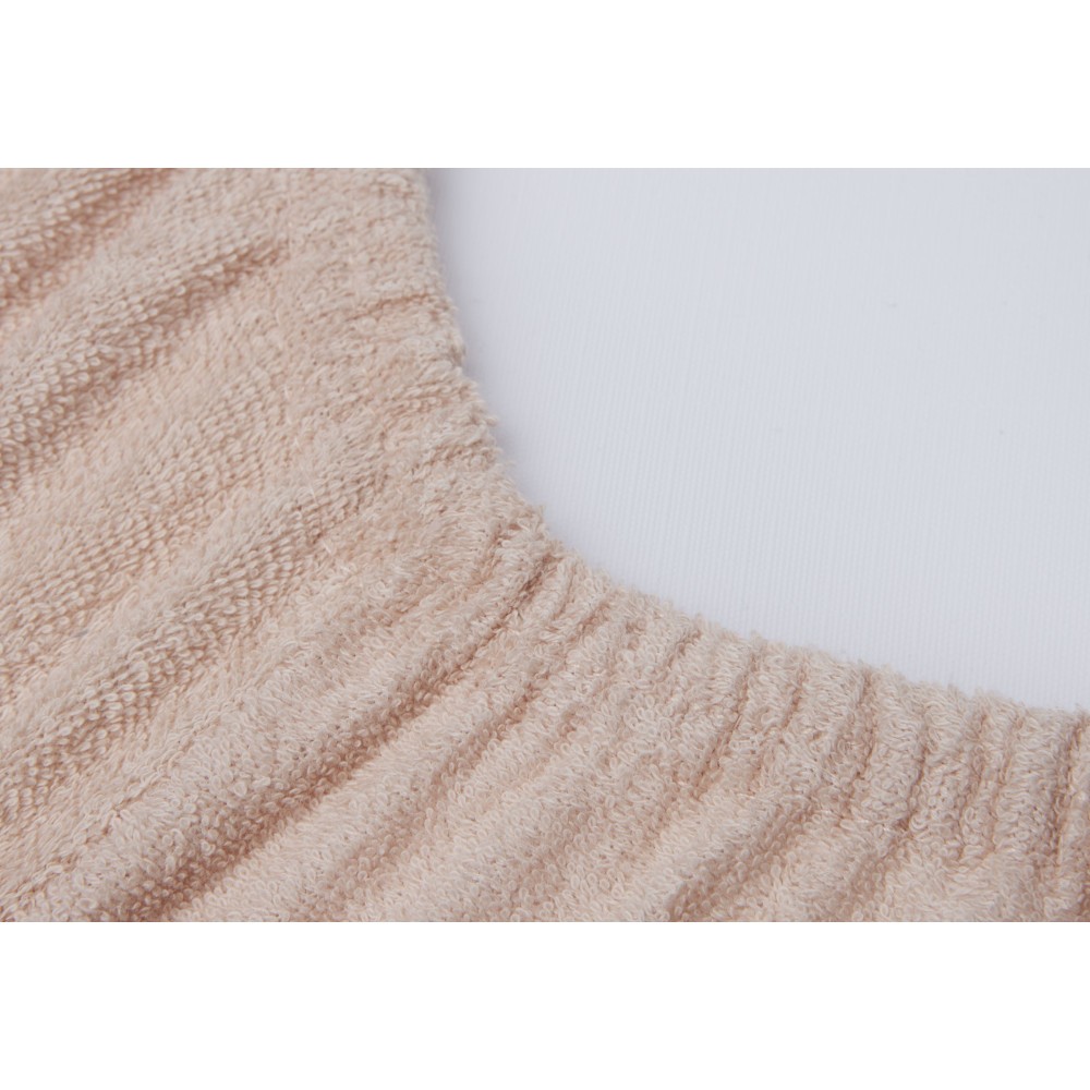 100 % coton éponge. Les bords sont élastiques comme pour un drap-housse. Elle reste ainsi en place.
