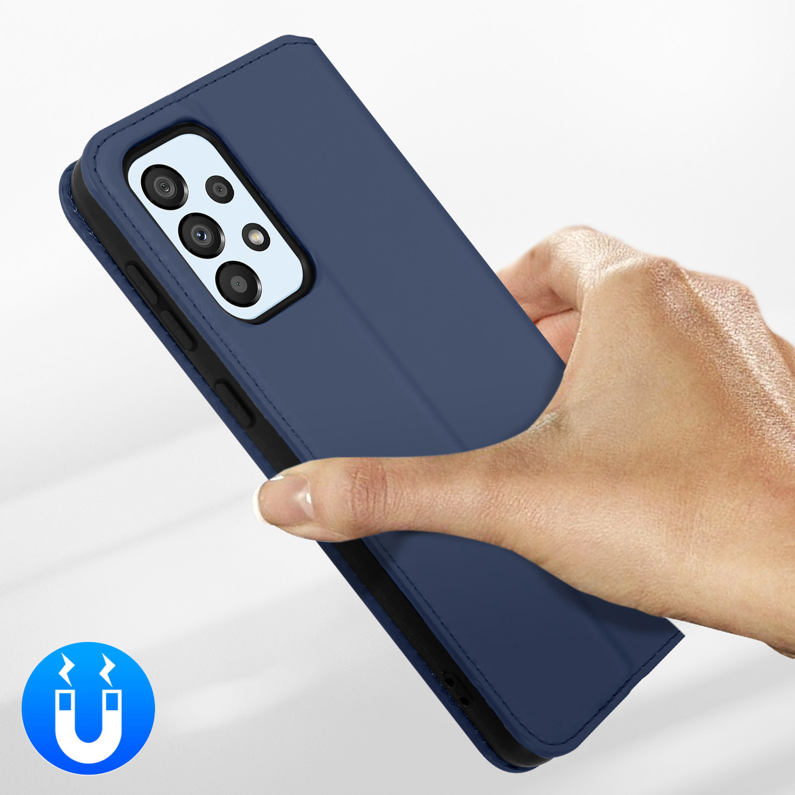 Étui folio avec clapet aimanté pour Samsung Galaxy A33 5G. Protection intégrale contre les chocs et rayures. Fonction support pour visualiser les contenus multimédias. Compartiments pour cartes intégrés dans le clapet. Fonctions accessibles.