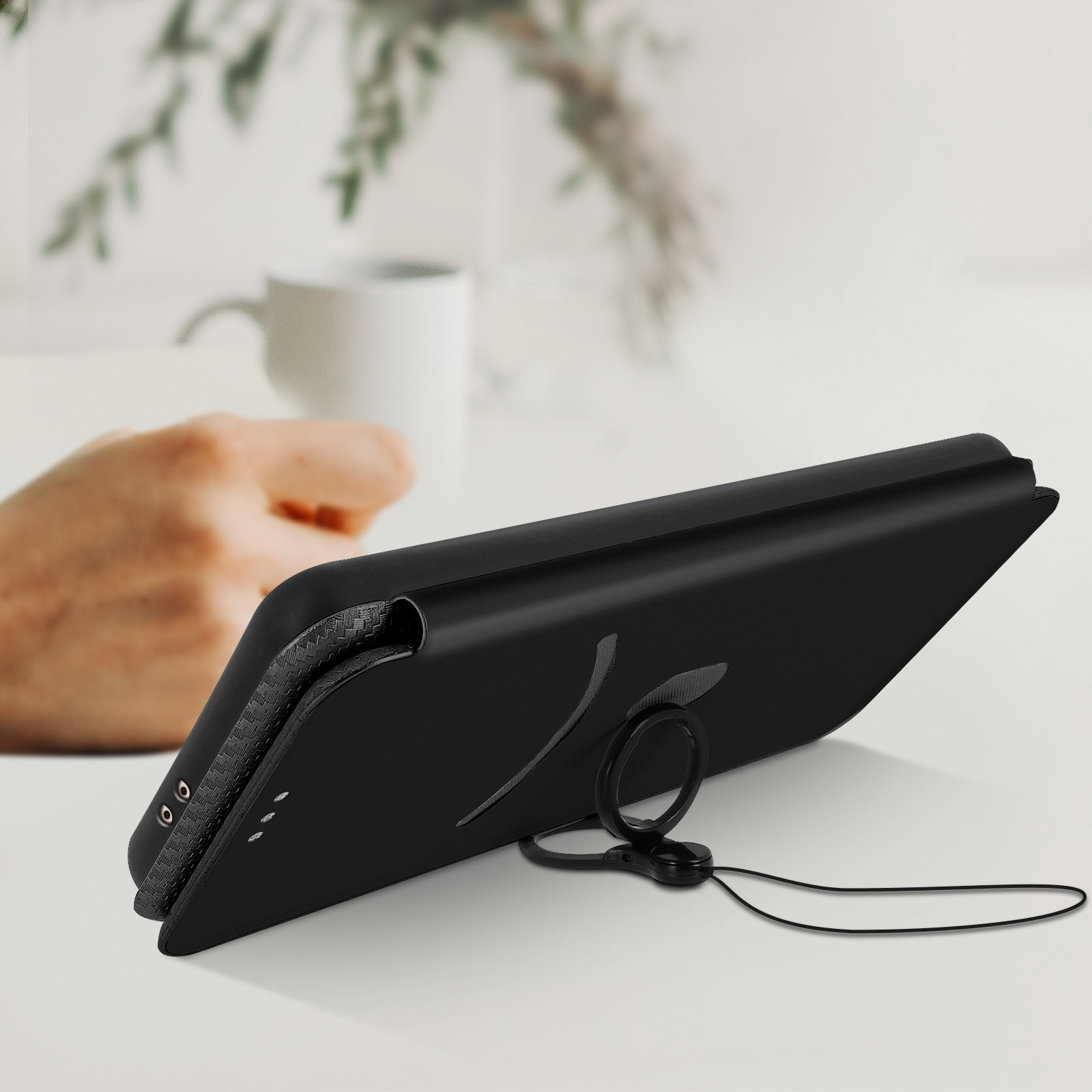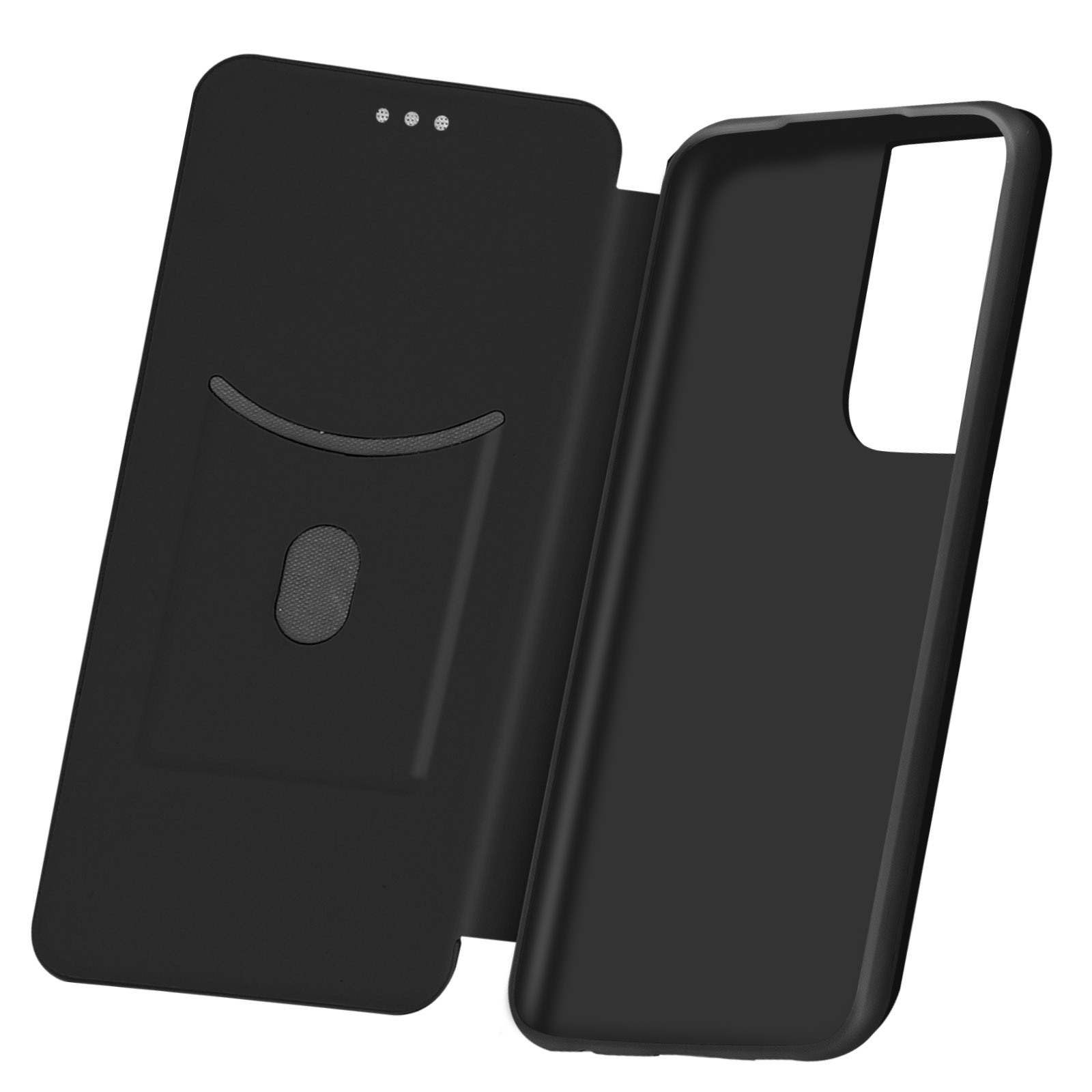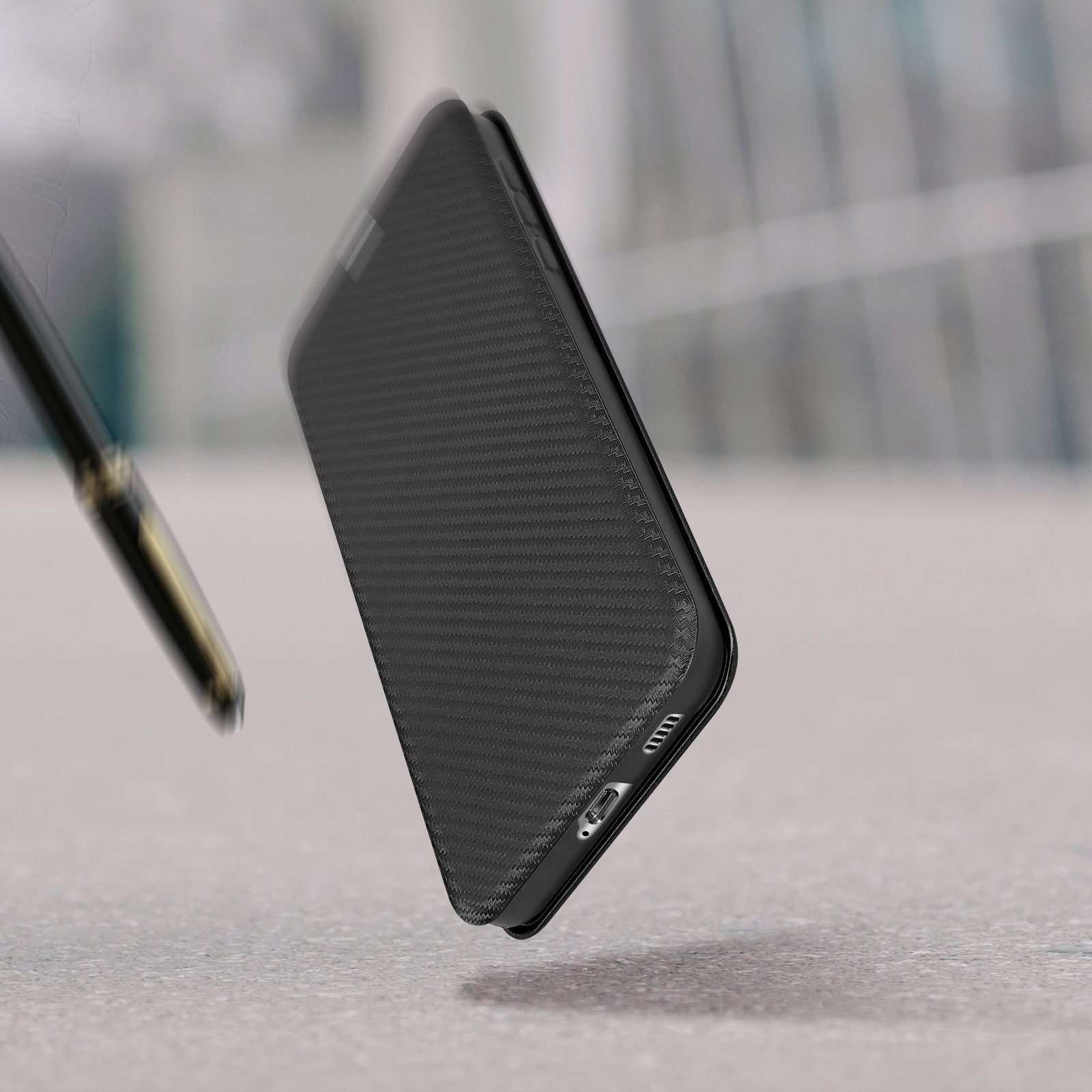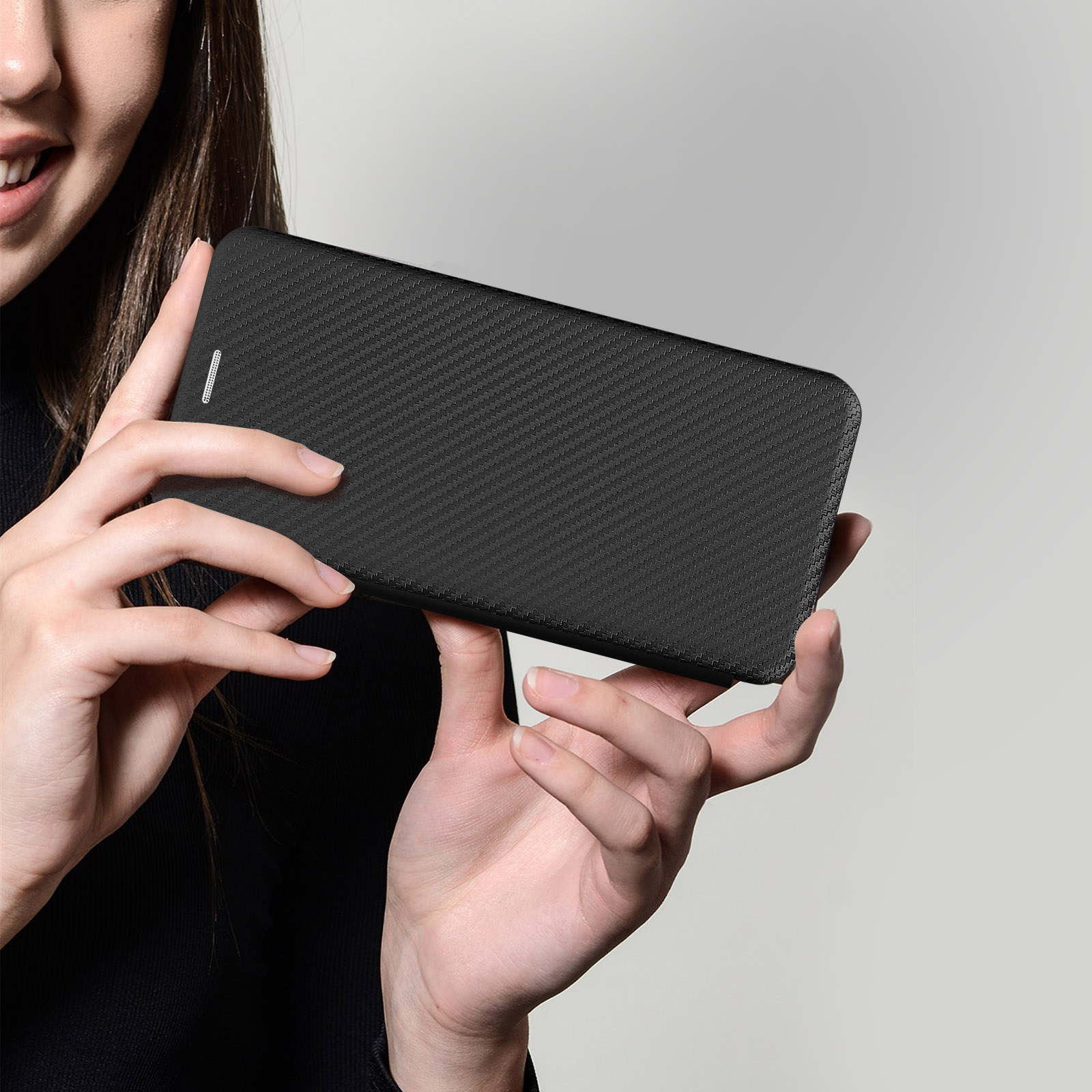 Housse folio pour Galaxy S21 Ultra. Protection intégrale à fermeture magnétique. Doublure Soft-touch. Rangement pour carte intégré au clapet. Revêtement élégant en éco-cuir effet carbone. Fonctions accessibles, coque sur-mesure souple. Dragonne incluse.