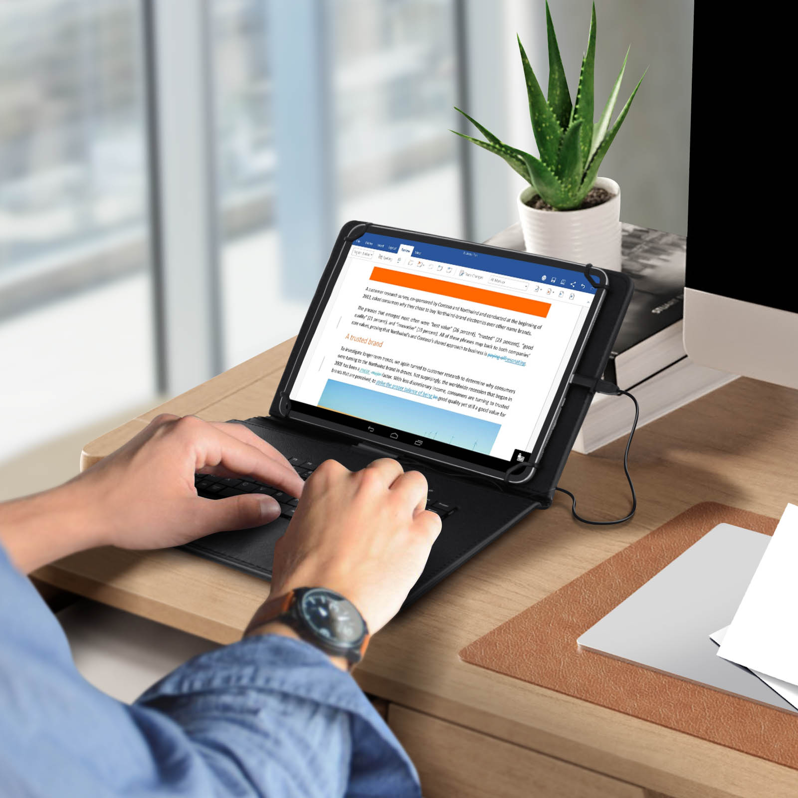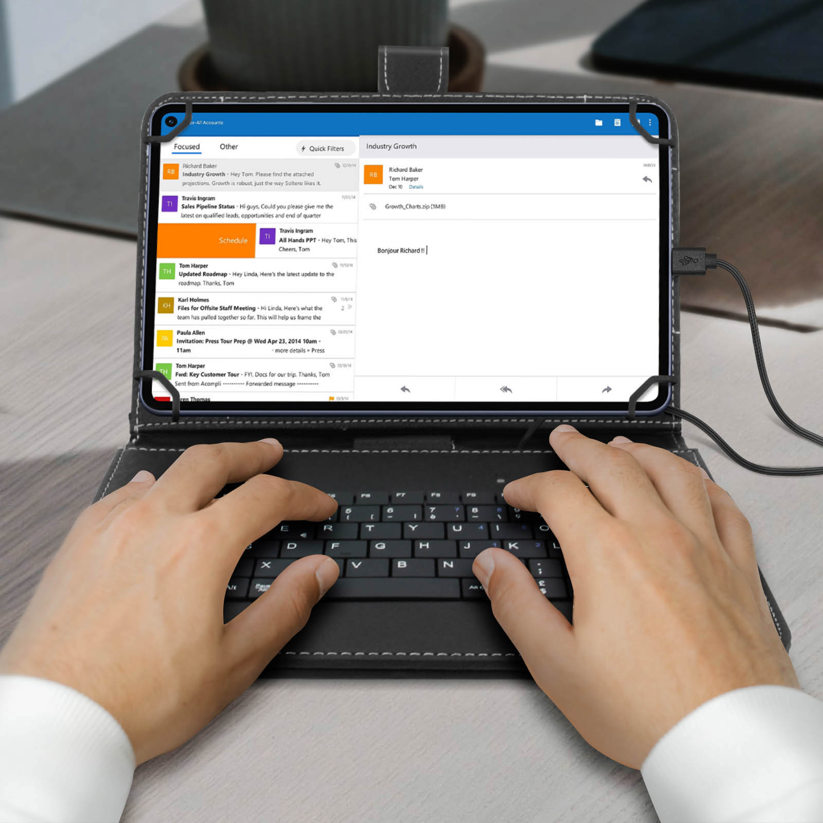 Housse folio pour les tablette 10 pouces équipées d'un port USB-C. Clavier AZERTY avec connecteur USB-C intégré pour une saisie optimale. Béquille pliable intégrée faisant office de support vidéo. Système de fixation à 4 grappins + languette magnétique.