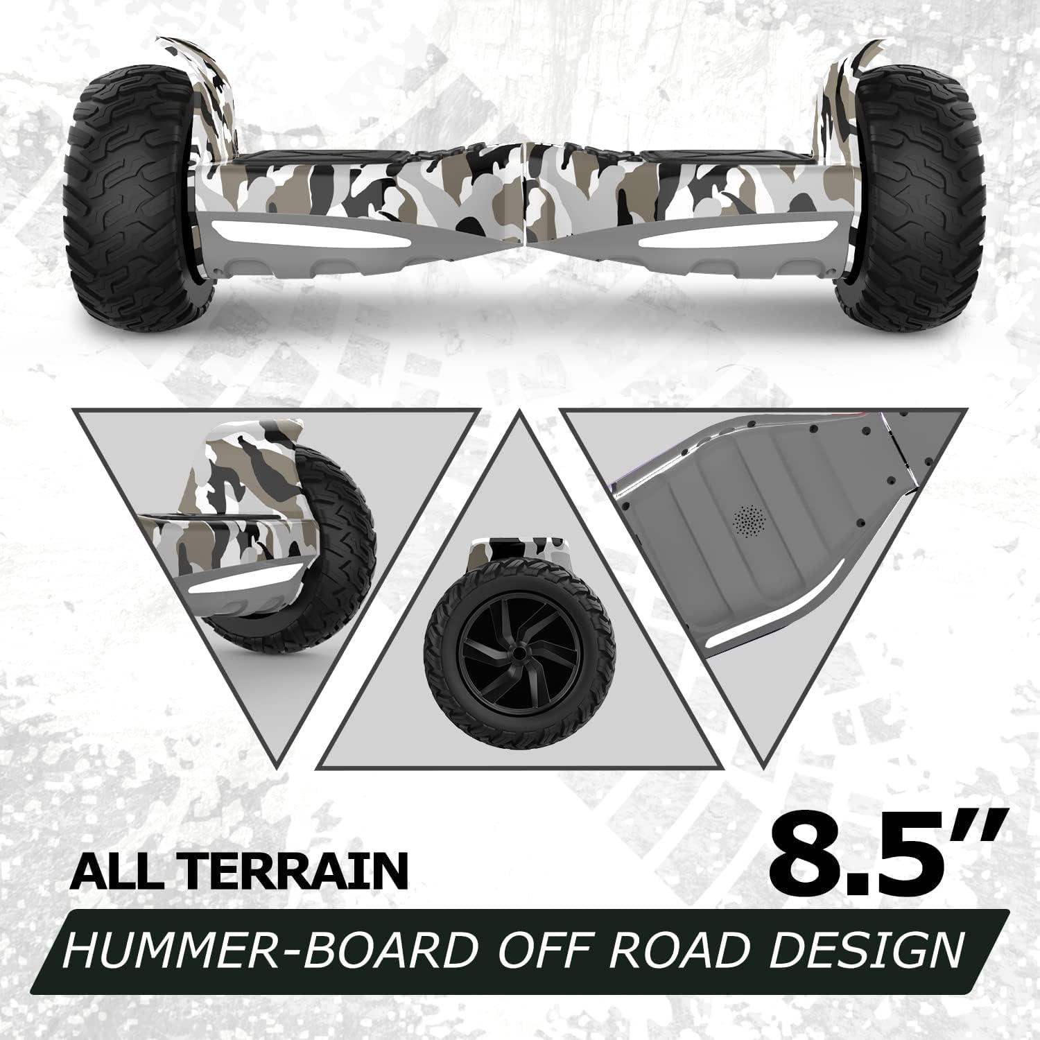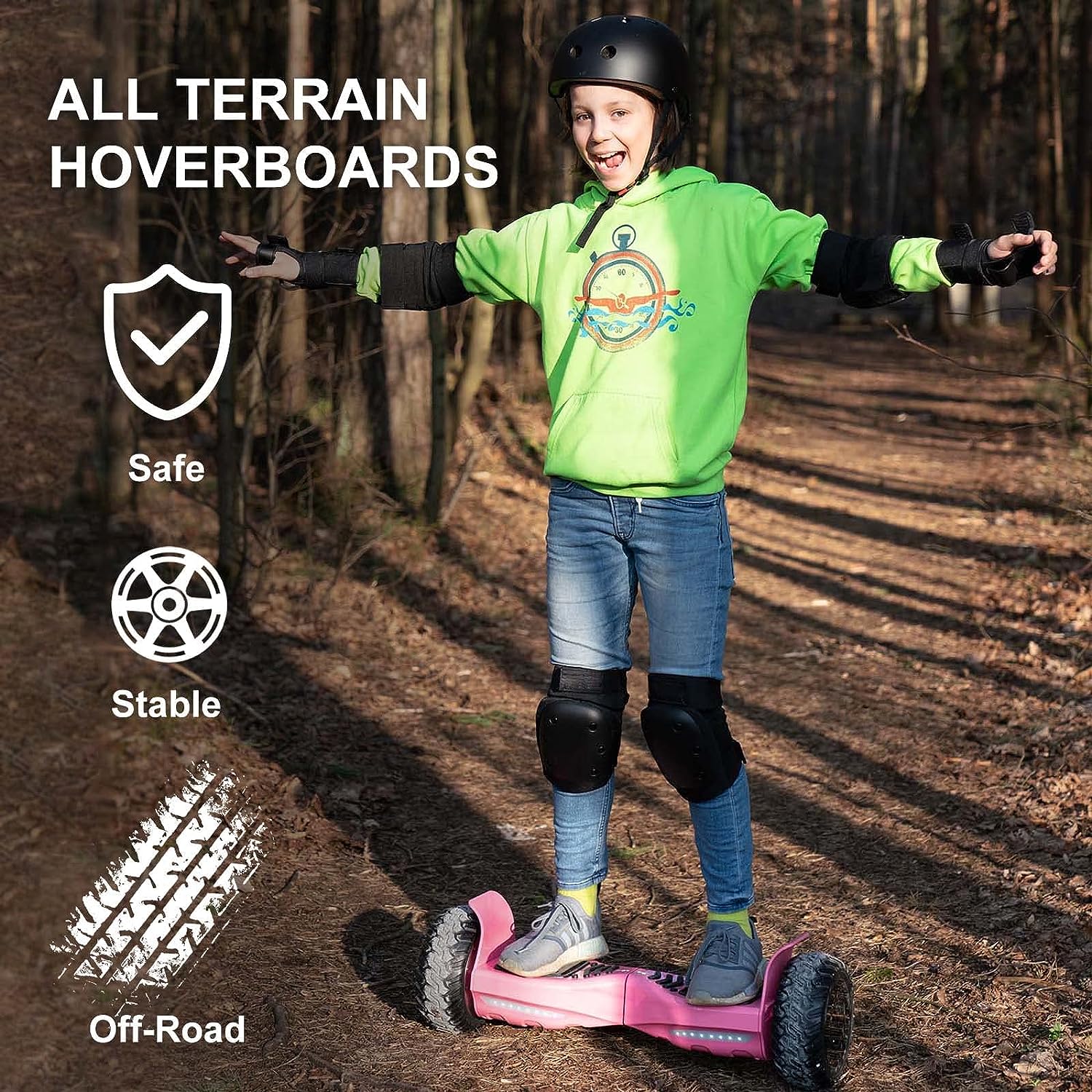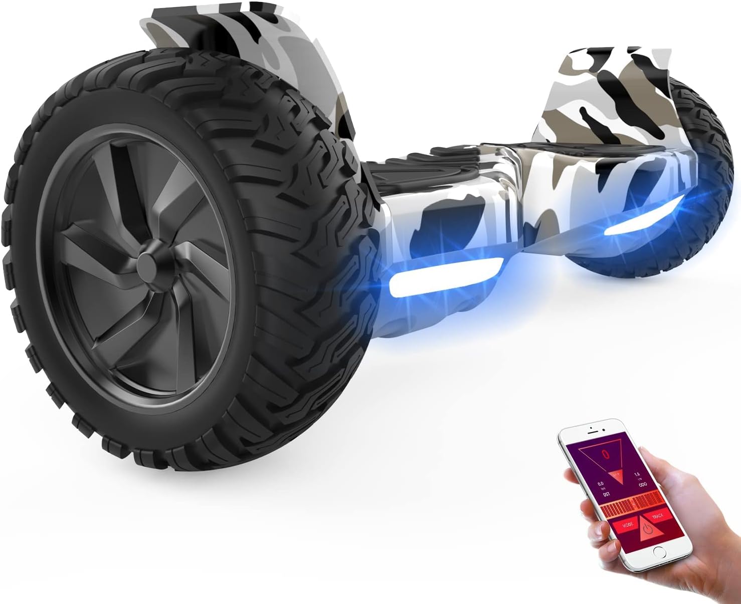 [ HOVERBOARDS TOUT-TERRAIN]: hoverboards conçus pour tout terrain, les pneus tout-terrain antidérapants et antidéflagrants de 8,5 pouces avec double moteur offrent une vitesse maximale de 15 km/h(dépend du poids de l'utilisateur, du mode de vitesse et des conditions routières, etc.) Idéal Cadeau pour Adolescents & Adultes