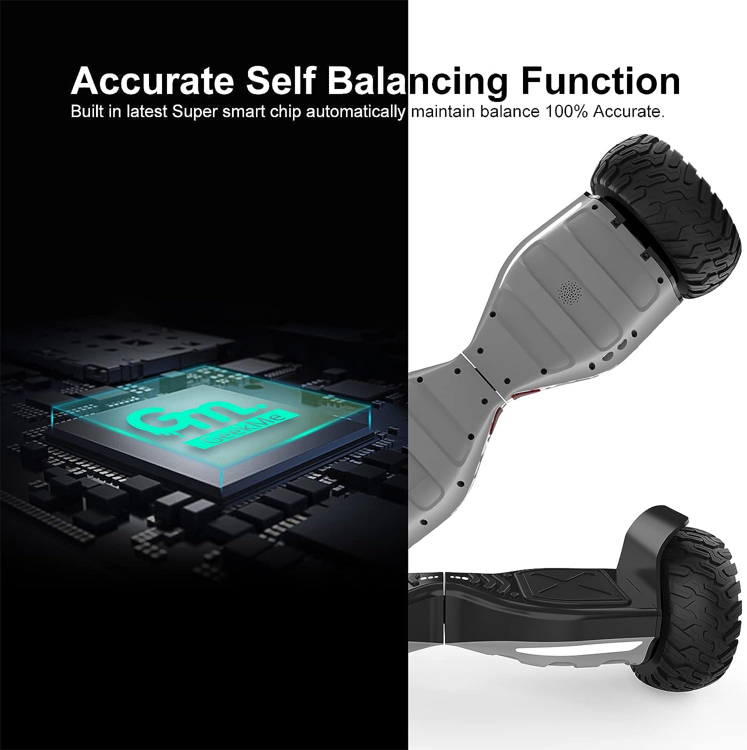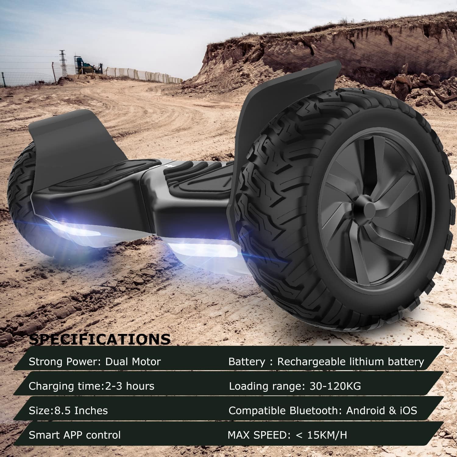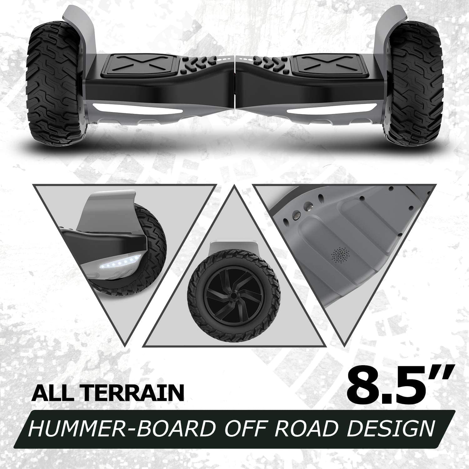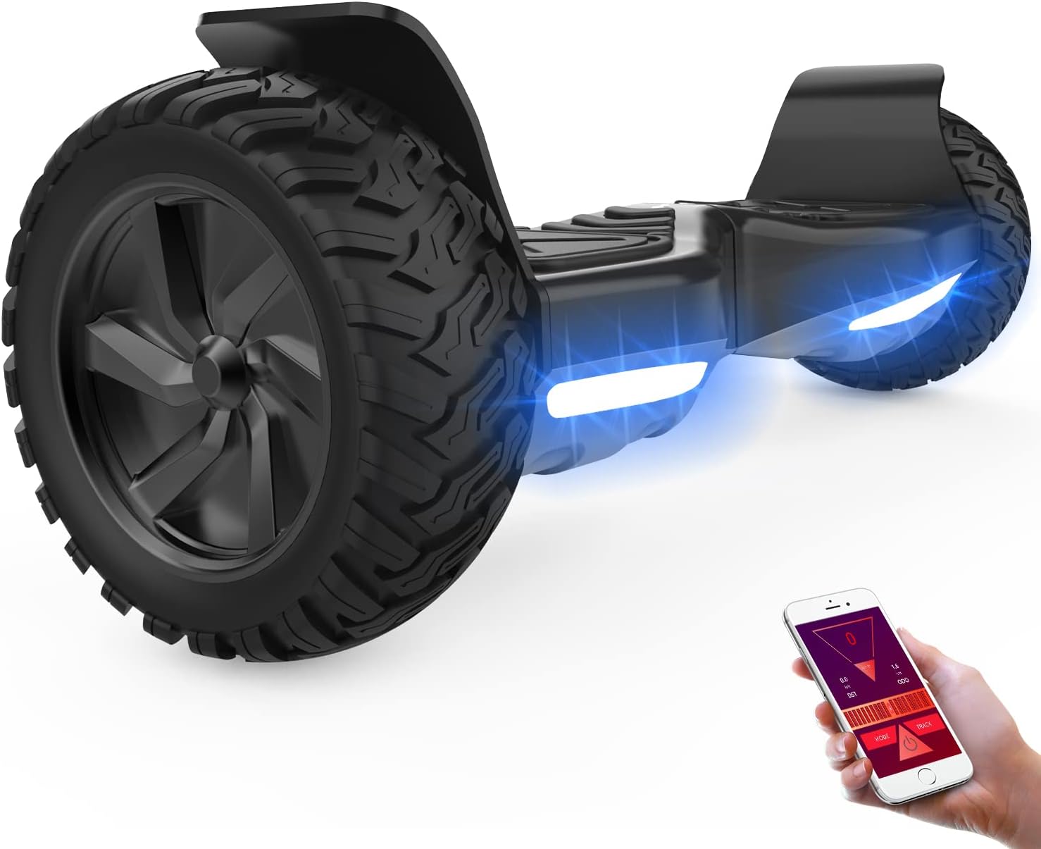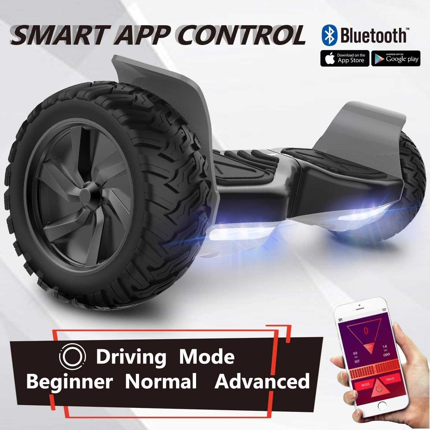 [ LUMIERES LED& HAUT-PARLEUR BLUETOOTH]:8.5" offroad hoverboards équipé de deux lumières LED pour une bonne navigation nocturne. ce haut-parleur de musique de marque intégré aux hoverboards hors route, se connecte à votre smartphone pour profiter de votre musique préférée.