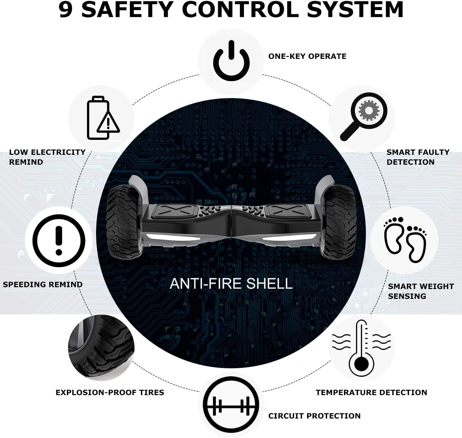 [ HOVERBOARDS TOUT-TERRAIN]: hoverboards conçus pour tout terrain, les pneus tout-terrain antidérapants et antidéflagrants de 8,5 pouces avec double moteur offrent une vitesse maximale de 15 km/h(dépend du poids de l'utilisateur, du mode de vitesse et des conditions routières, etc.) Idéal Cadeau pour Adolescents & Adultes