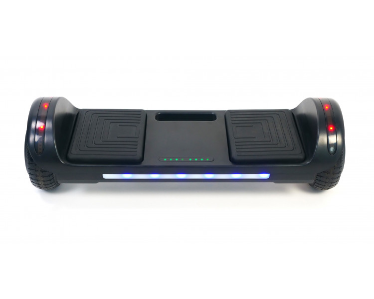 Conception high-tech et bénéficiant de la nouvelle technologie Ultra Sensor, haut de gamme et durable - Sa structure basse en aluminium massif le rend particulièrement robuste, évitant les désagrément des coques plastiques. Moyen de locomotion moderne, respectueux pour l'environnement, ne produit aucune émission, adapté à un usage ludique et pour des déplacements inférieur à 10 kms Equipé de 2 roues (6,5 pouces) offrant adhérence et stabilité avec moteurs Hub intégrés, bandage caoutchouc souple, non gonflable et increvable Léger et compact (7 kg) pour être transporté ou rangé aisément, sa poignée de transport en facilitera l'usage - Fonctions : 2 Lumières LED (12 V-100 mA) sur les garde boue permette la visibilité et la signalisation des ordres de commandes de l'appareil (1-Trajet lineaire= lumières fixe, 2 - virage clignotant gauche ou droit / marche arrière = Lumières clignotantes) Autre paramétrage de sécurité: Un Signal sonore est émis au-dela de 10 km/h. Si la vitesse excessive est prolongée l'appareil se met sur position neutre.L'appareil se coupe immediatement lorsqu'il est saisi par la poignée. Matériel repondant à la norme de référence CE, EN60335 (1-2) SPECIFICITES: Vitesse maxi : 12 km/ h (suivant poids de l'utilisateur) Autonomie : de 1h (10 km) (suivant poids et parcours, plat ou vallonné) Pente maximum 15°- conditions de température d'utilisation maxi : de 0 à 45 °C Puissance moteur : 2x250 W, intégrés dans le moyeu des roues Bluetooth Batterie 10 cell : en Lithium, ignifugée, 2,0 Ah, 36 Volts, carte intelligent BMS Nombre de cycle de charge de la batterie : de 500 à 800 cycles Chargeur : Tension entrée 110/240 V 50/60 Hz, tension de sortie MAX 42V, 1.0A Temps de charge : environ 2/3 heures Etanchéité autour du logement de la batterie : IPX4 Structure bas de caisse en aluminium