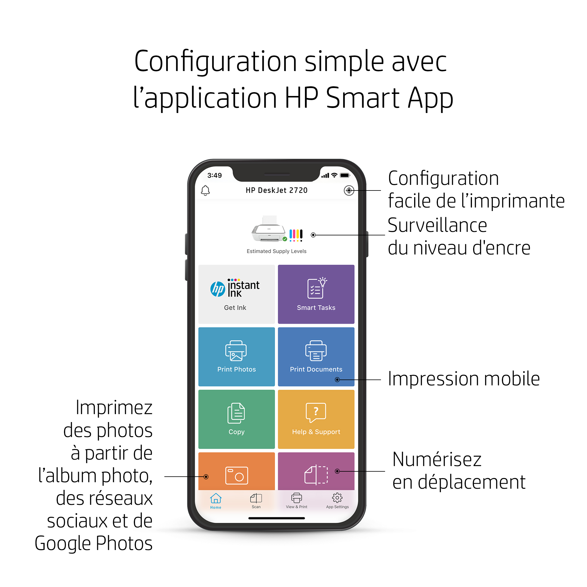 Recherchez la simplicité Toutes les fonctions de base, désormais faciles à utiliser. Imprimez, numérisez et copiez les documents quotidiens, et profitez d'une connexion simple et sans fil.[1] Une configuration simple avec l'application HP Smart vous permet de travailler sur n'importe quel appareil.[2]. Compatibilité HP Instant Ink