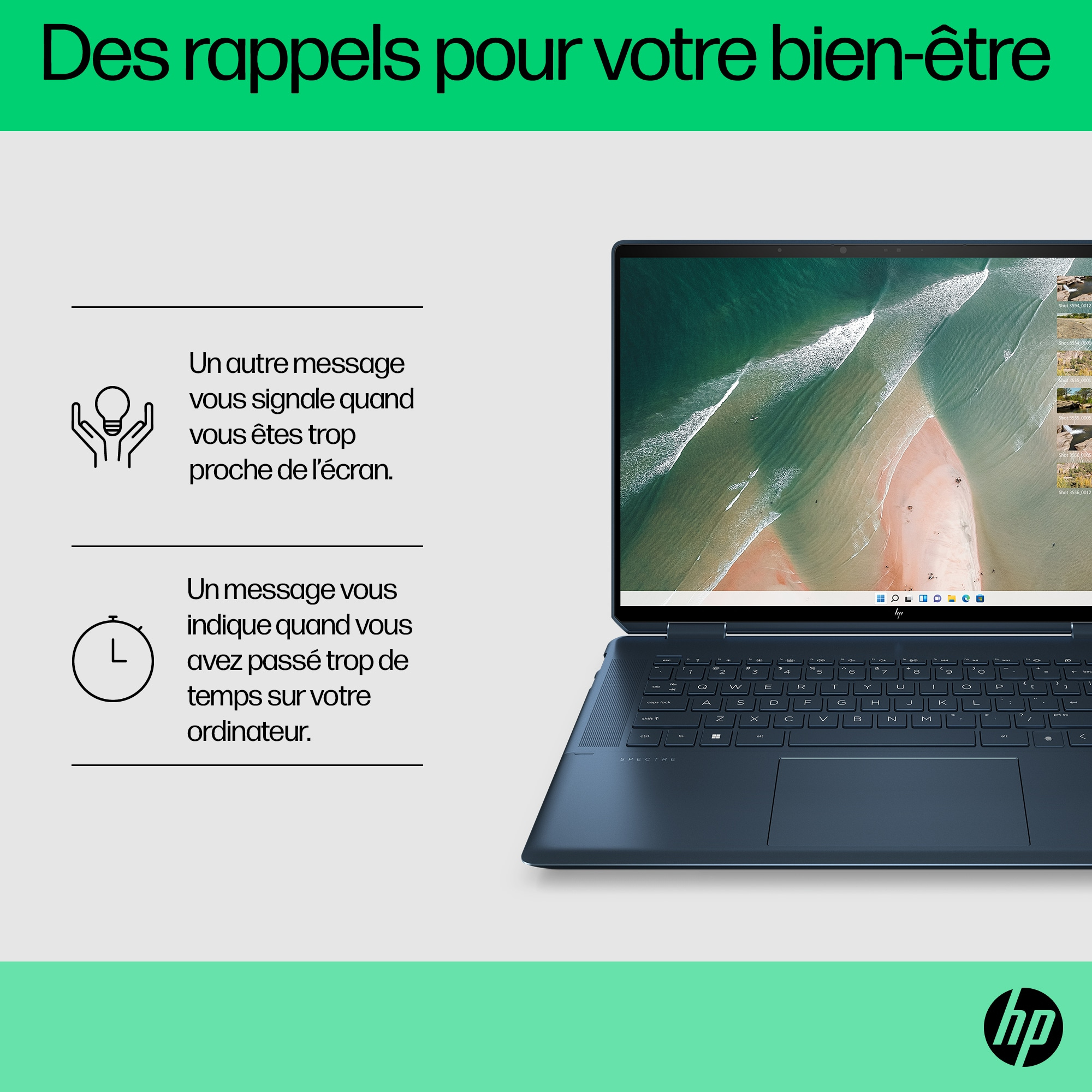 L’ordinateur portable HP Spectre x360 est alimenté par un processeur Intel®[2] qui s’adapte à vous pour une approche multitâche supérieure. Avec un écran plus grand, vous pouvez afficher davantage de contenu avec moins de défilement. Impressionnez grâce à HP GlamCam, une caméra intelligente de 5 MPX[3] qui vous permet de rester dans le cadre et bien éclairé. De plus, protégez votre bien-être avec des rappels de temps d’écran et de distance.