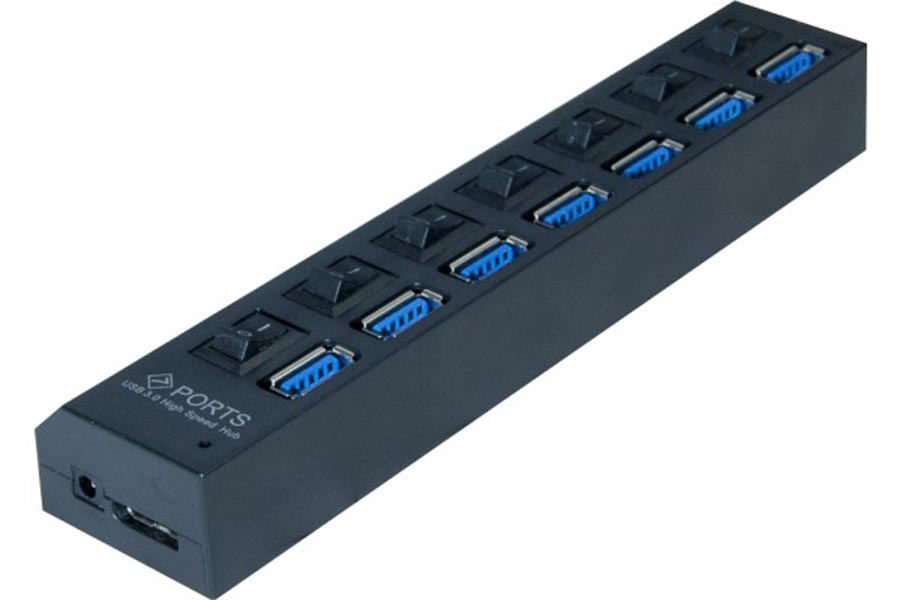 Hub USB 3.0 7 ports avec interrupteurCe hub USB vous permettra de profiter rapidement de 7 ports USB 3.0 supplémentaires sur votre ordinateur avec l'avantage de pouvoir démarrer ou arrêter chaque périphériques à l'aide des 7 interrupteurs. Chaque port dispose d'une led bleue allumée lorsqu'un périphérique est connecté dessus. -Très beau design en longueur - Interrupteur marche / arrêt pour chaque port-Robuste -Faible encombrement-Taux de transfert maximum de 5 Gbps grâce à l'USB 3.0 -Compatible avec les normes USB 2.0 et USB 1.1 (vitesse réduite à la norme) -1 led bleue de connexion par port Caractéristiques principales : -Nombre de ports : 7 (avec interrupteurs) -Connecteur(s) : 7x USB 3.0 type A -Câble de 60 cm USB 3.0 type A (M)/Micro USB 3.0 fourni pour la connexion à l'ordinateur -Alimentation externe : optionnelle -OS supportés : Windows 9x se, Vista, XP, Windows 7, Windows 8x, Windows 10 ou MAC OS 9.1 / X -Dimensions : 165 x 37 x 22 mm