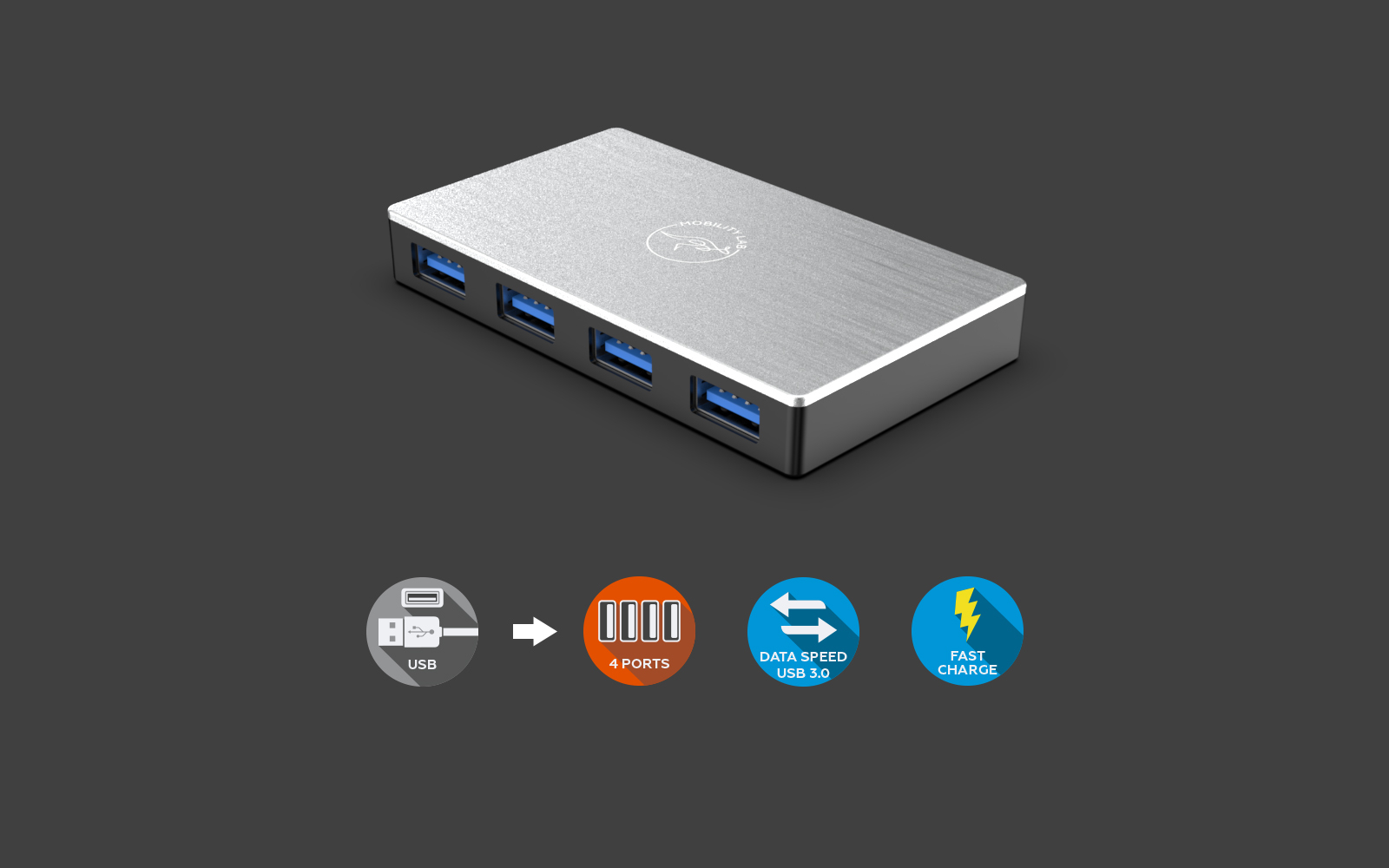 HUB en aluminium 4 ports Technologie USB 3.0 idéale pour un environnement Hi Tech Plug & Play Compatible Mac et PC Aucune installation de logiciel requise Adaptateur mural 5V / 2.5A inclus pour assurer le bon fonctionnement de vos périphériques USB sans surcharge Les ports USB 3.0 prennent en charge le transfert de données depuis USB 3.0 (5 Gbps), USB 2.0 (480 Mbps) et USB 1.1 (12 Mbps) Le concentrateur peut également être utilisé pour charger vos appareils tels qu'un smartphone ou un iPod (500mA / 5V)