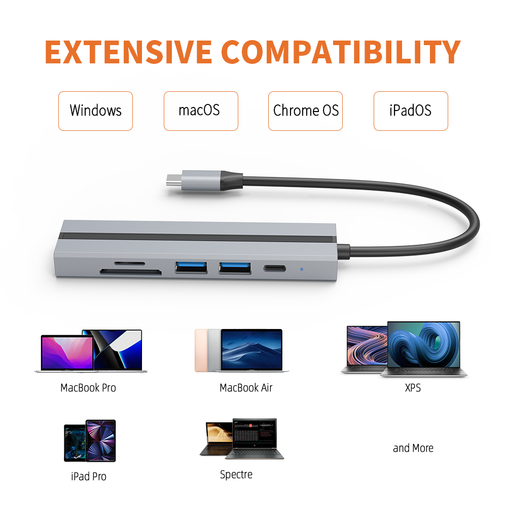 | Libellé | Hub USB-C 6-en-1 avec HDMI 4K, ports USB 3.0/2.0, lecteur de carte SD/TF |