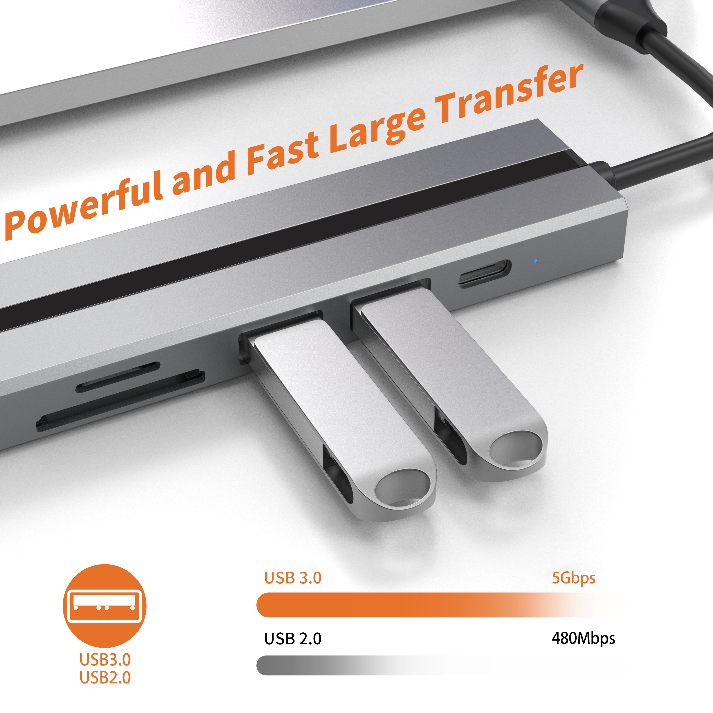 La prise de charge USB-C PD prend en charge une charge rapide jusqu'à 100 W de vos appareils en amont. Les deux ports USB-A offrent un transfert de données rapide avec 5 Gbit/s (USB3.0) et 480 Mbps (USB2.0).