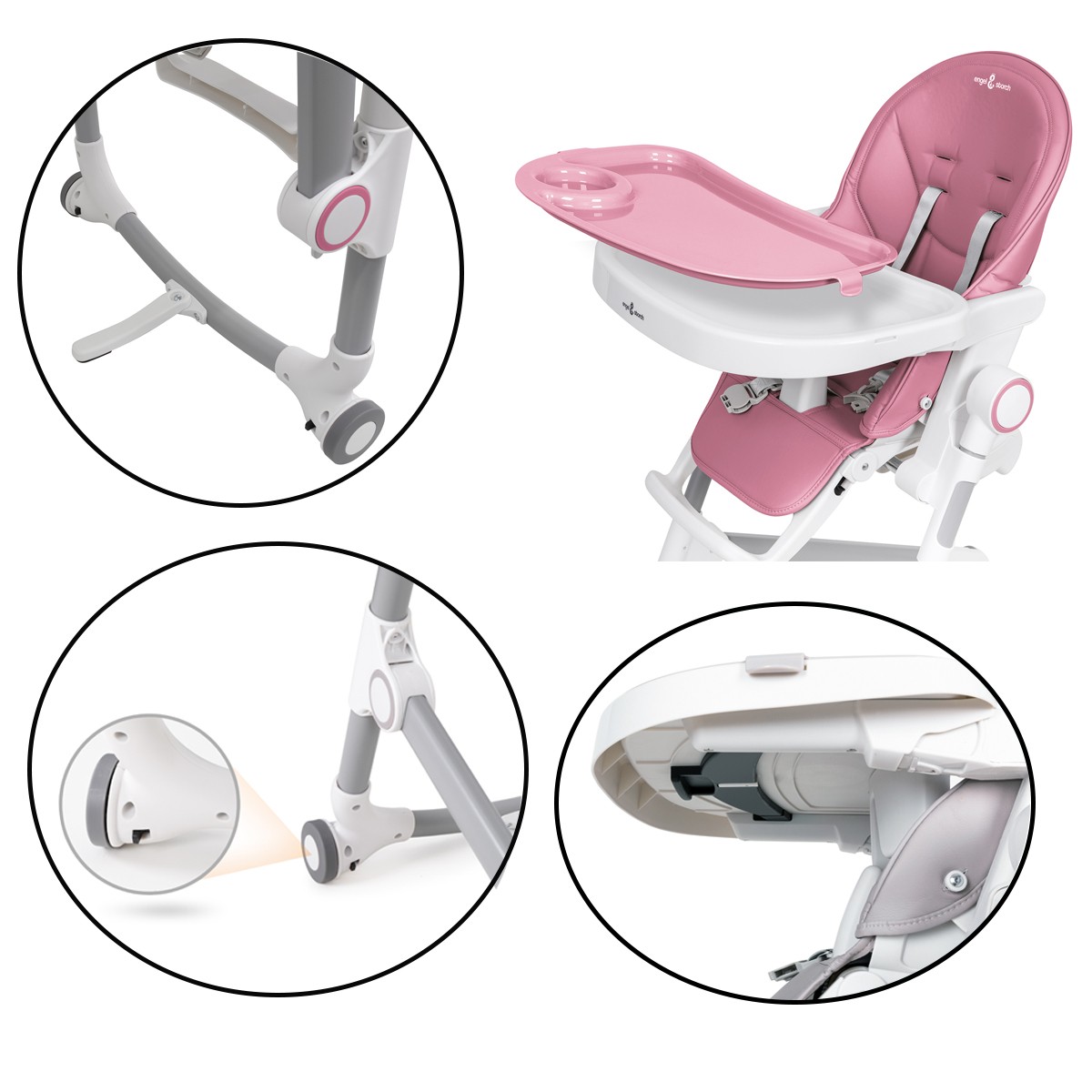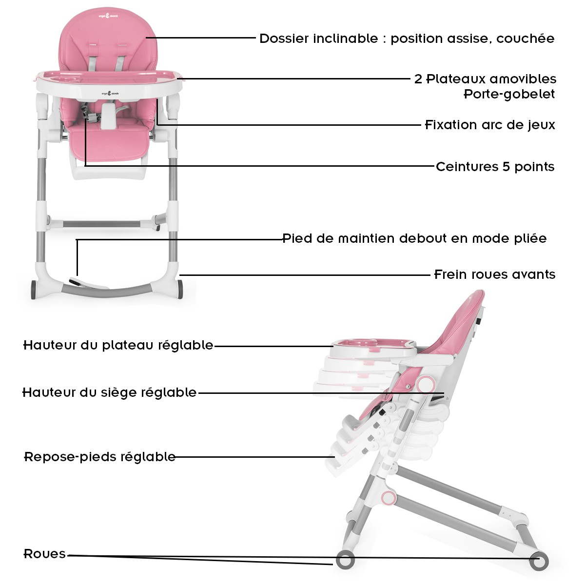 | Libellé | HUGO Chaise haute pliable et inclinable + arche de jeux Rose |