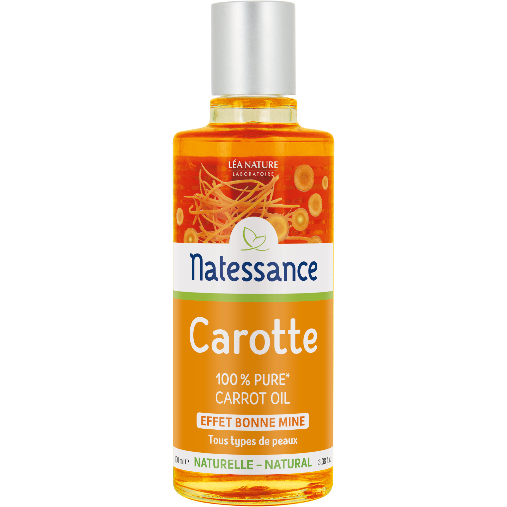 Natessance Huile de Carotte 100 ml est une huile 100% pure formulée avec du macérat de carotte et de la vitamine E naturelle. Cette huile est concentrée en Béta carotène et en provitamine A. Ces actifs permettent de nourrir votre peau et de lui donner un teint hâlé naturel instantané. L'huile de carotte est idéale dès les beaux jours pour donner un coup d'éclat sur le visage et le cou.