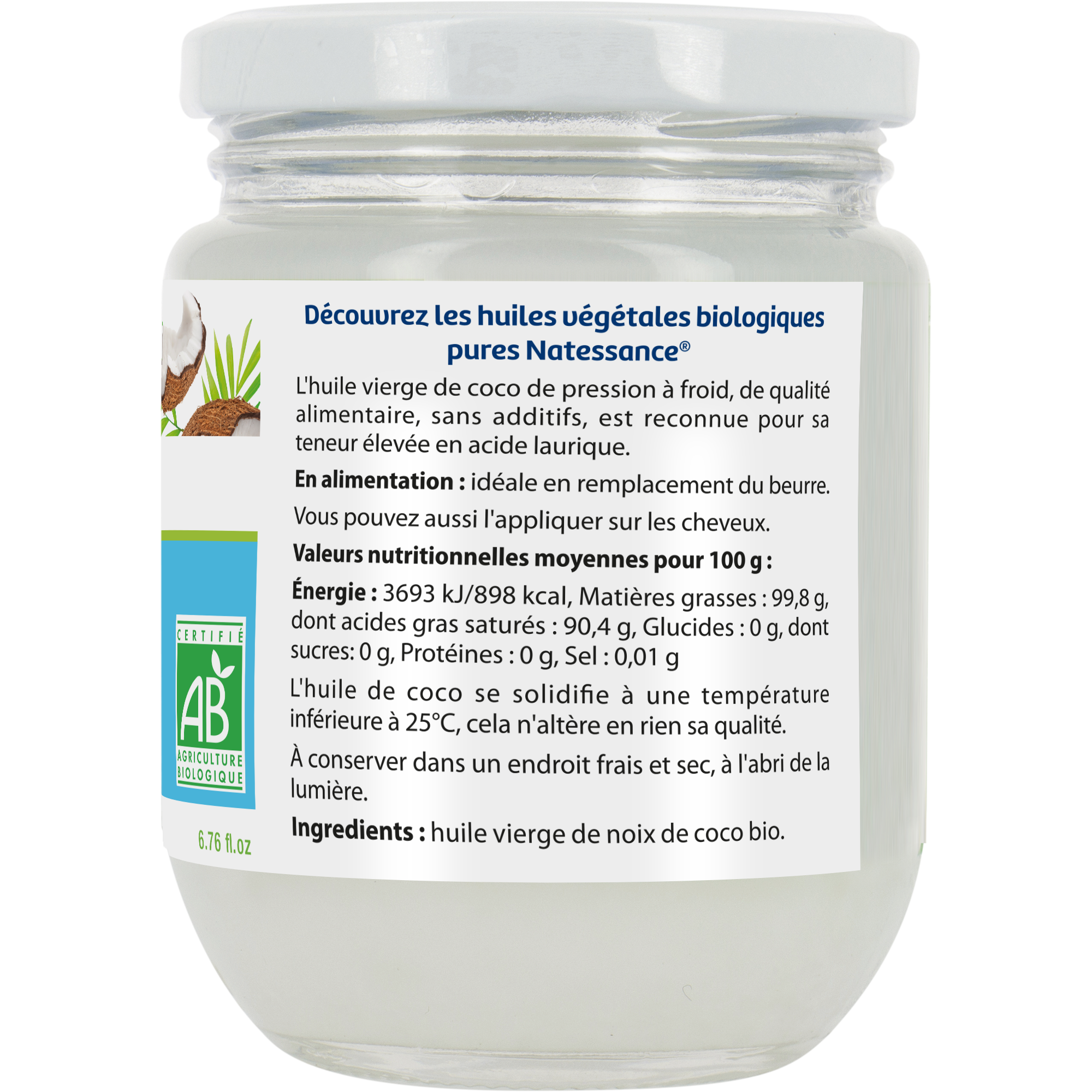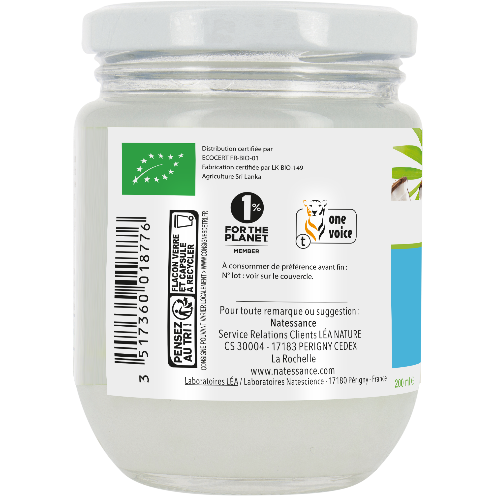 Natessance Huile de Coco Bio 200 ml est une huile 100% pure et nourrissante. Cette huile vierge de coco de pression à froid, de qualité alimentaire, sans additifs, est reconnue pour sa teneur élevée en acide laurique. Elle est idéale en remplacement du beurre et peut s'appliquer sur les cheveux. Elle se solidifie à une température inférieure à 25°C, cela n'altère en rien sa qualité. Certifié Agriculture Biologique. Distribution certifiée par ECOCERT FR-BIO-01. Fabrication certifiée par LK-BIO-149. Membre de 1% For The Planet (gamme éthique, éco-conçue et reversant 1% de son chiffre d'affaires à des associations environnementales). Membre de One Voice, association de loi de 1908 qui mène un combat non violent pour les droits des animaux et le respect de toute vie.