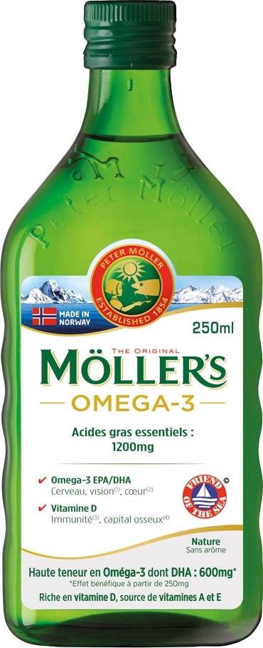 Möller's Omega 3 Huile de Foie de Morue Sans Arôme 250 ml est un complément alimentaire sous forme de solution buvable à base d'huile de foie de morue et de vitamines. Ce complément alimentaire contient une haute teneur en Oméga-3 dont DHA (600 mg). Le DHA contribue au fonctionnement normal du cerveau et au maintien d'une vision normale. L'EPA et le DHA contribuent à la fonction cardiaque normale. Sa formule est riche en Vitamine D, et est source de Vitamines E et A. La Vitamine D contribue au fonctionnement normal du système immunitaire et au maintien d'une ossature normale. Ce complément convient à toute la famille, aux enfants à partir de 4 ans.