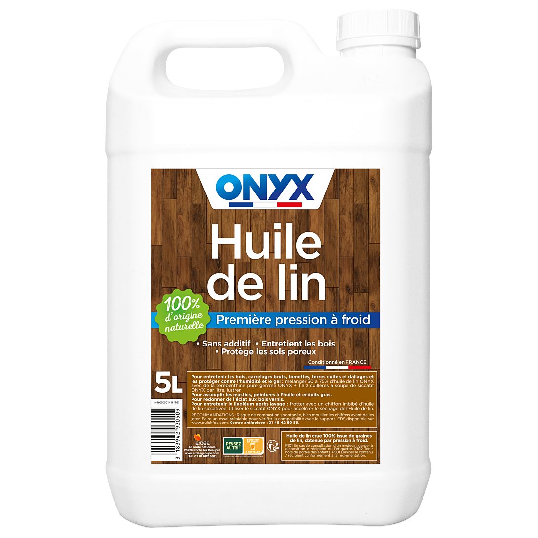 L’Huile de lin Onyx est une huile de lin crue de qualité, 100% issue de graines de lin, obtenue par première pression à froid. Elle permet d’entretenir les bois, carrelages bruts, tomettes, tuiles, terres cuites et dallages et de protéger ces différents supports contre l’humidité et le gel. L’Huile de lin Onyx s’utilise aussi pour assouplir les mastics, peintures à l’huile et enduits gras.