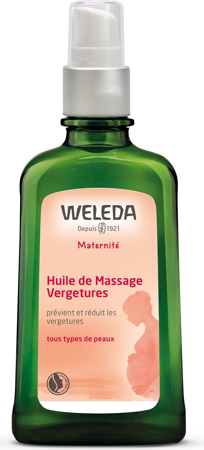 Pendant la grossesse, la peau est soumise à rude épreuve. Les tensions qu'elle subit peuvent laisser apparaître les stries blanches que l'on nomme vergetures, et qui sont la conséquence de la rupture de fibres élastiques au sein du derme. Pour répondre aux besoins spécifiques de la femme enceinte, Weleda a créé l'Huile de Massage Vergetures à base d'huiles d'amande douce, de jojoba bio et de germe de blé naturellement riche en vitamine E et enrichie en extrait d'arnica bio. Appliquée en massages dès le début de la grossesse, l'Huile de Massage Vergetures favorise la prévention et la réduction des vergetures, en améliorant l'élasticité et la tonicité de la peau. Permet l'échographie.
