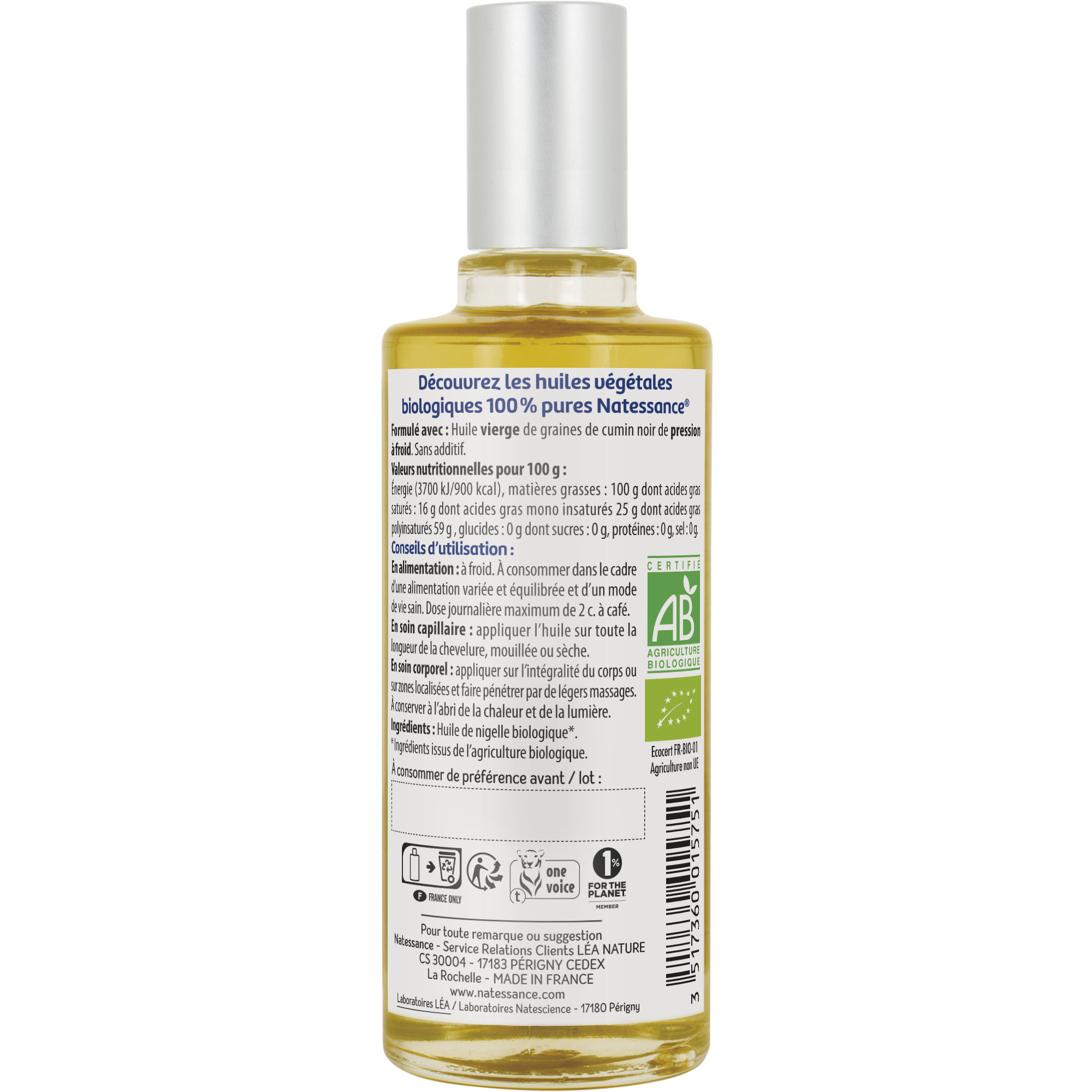 Natessance Huile de Nigelle Bio 50 ml est une huile 100% pure certifiée biologique formulée avec de l'huile vierge de graines de cumin noir de pression à froid sans additif. L'huile de Nigelle riche en acides gras essentiels et en vitamines, tonifie et purifie la peau et est donc idéale pour les peaux acnéiques. Elle est aussi préconisée pour adoucir et assouplir la peau pendant un massage. Cette huile riche en vitamine E naturelle aux propriétés antioxydantes aide à lutter contre le vieillissement prématuré cellulaire et la formation des radicaux libres. Testée sous contrôle dermatologique. Formule non testée sur animaux.