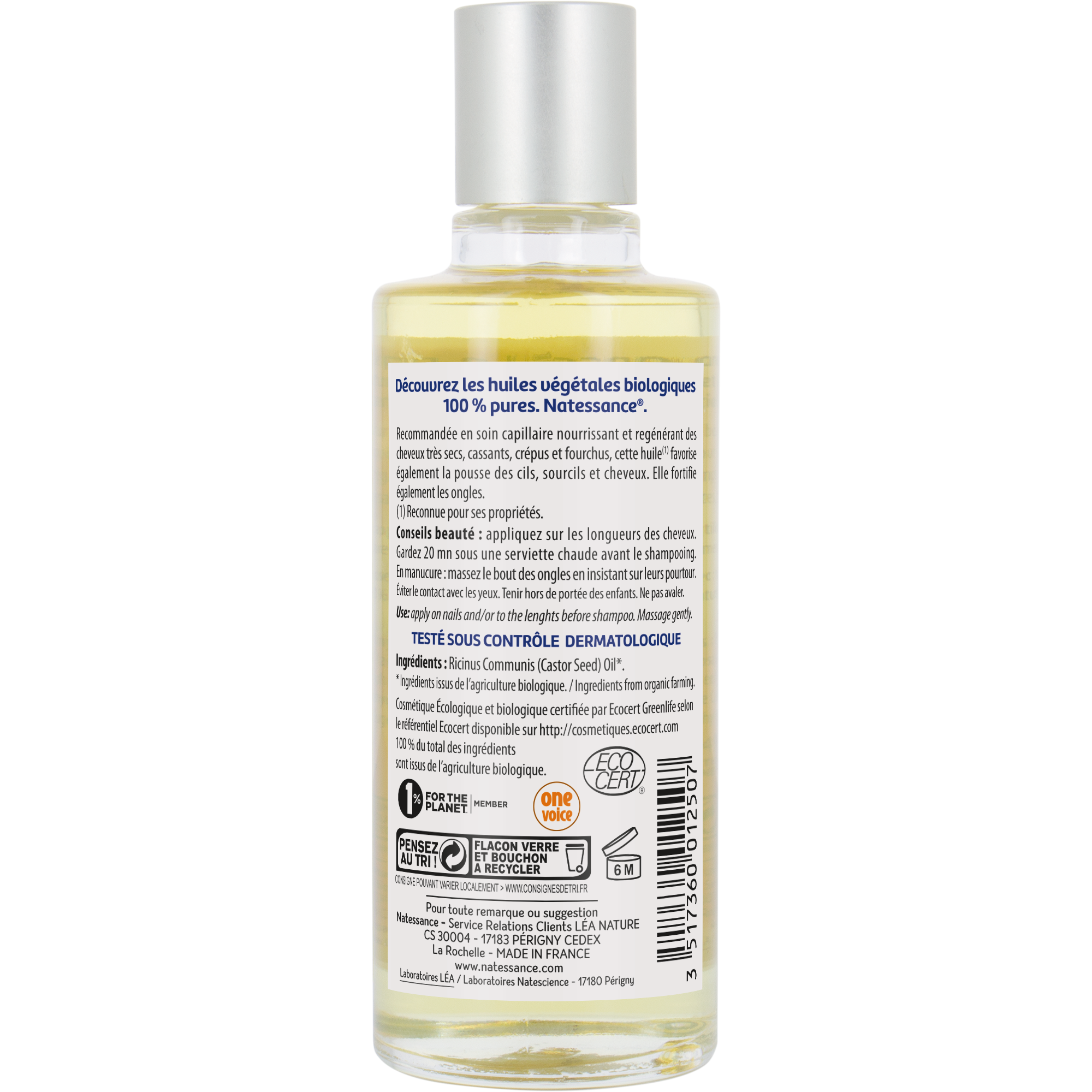 En soin capillaire : à appliquer l'huile de ricin bio Natessance® sur cheveux secs, en massant doucement. Gardez 20 mn sous une serviette chaude avant le shampooing. En manucure : masser le bout des ongles en insistant sur leurs pourtours.