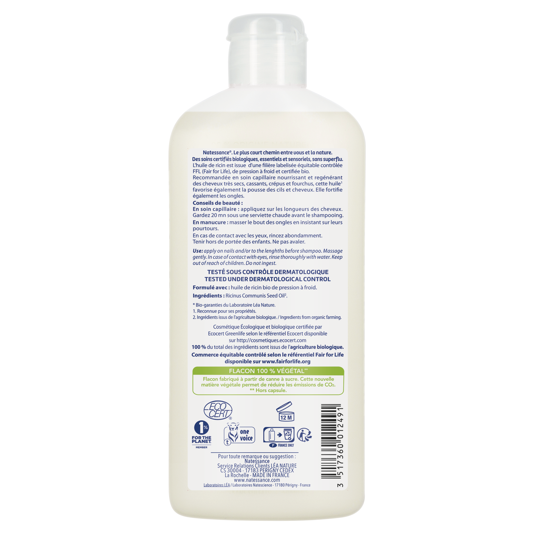 Recommandée en soin capillaire nourrissant et regénérant des cheveux secs et abîmés, cette huile favorise la pousse des cils, sourcils et cheveux. Elle fortifie également les ongles. TESTÉ SOUS CONTRÔLE DERMATOLOGIQUE