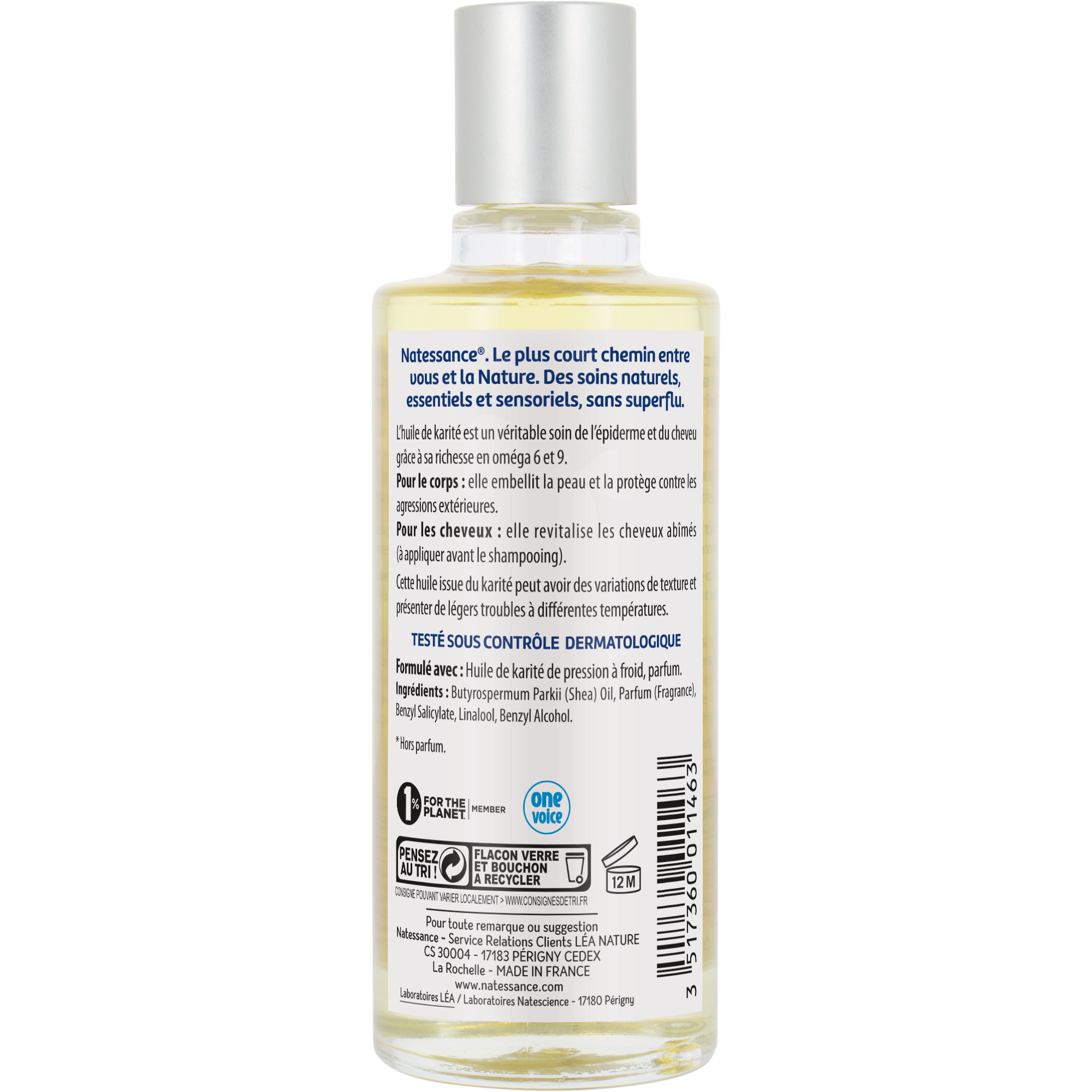 L'huile de karité est plus facilement absorbée par la peau que le beurre de Karité dont elle est issue. Ainsi grâce à sa richesse, supérieure au beurre (insaponifiables, omégas 6, 9 et vitamine E), elle se révèle être un véritable soin de l’épiderme et du cheveu.