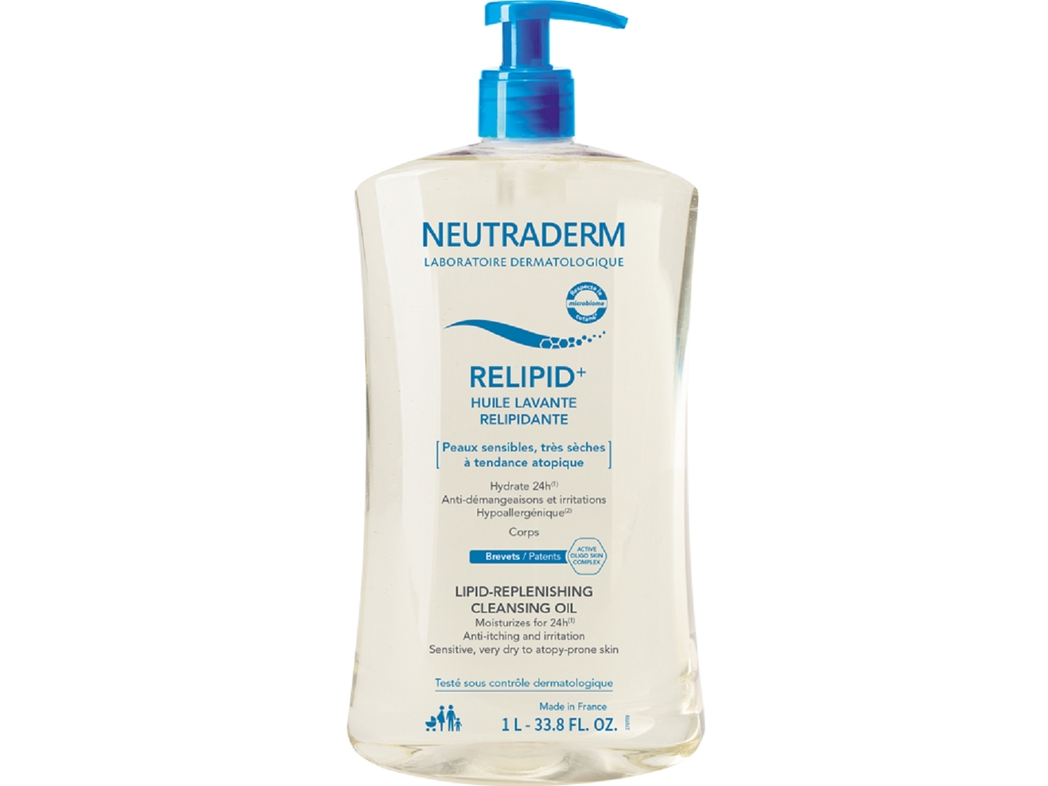 Neutraderm Relipid+ Huile Lavante Relipidante 1 Litre est un soin à base d'un actif naturel breveté, l'Active Oligo Complex apaisant, reminéralisant et restructurant la peau. Issu de l'eau d'Iroise et fortement concentré en minéraux et oligo-éléments, il restaure la barrière cutanée et maintient l'équilibre du microbiome de la peau. Cette huile respecte la peau et préserve son film hydrolipidique. Elle offre une hydratation durable de 24 heures. Elle empêche les démangeaisons et prévient les irritations. Protégée des agressions extérieures et du dessèchement, la peau est apaisée, de nouveau confortable, souple et douce. Sa texture agréable permet un nettoyage en douceur pour un véritable plaisir d'utilisation. Elle convient à toute la famille