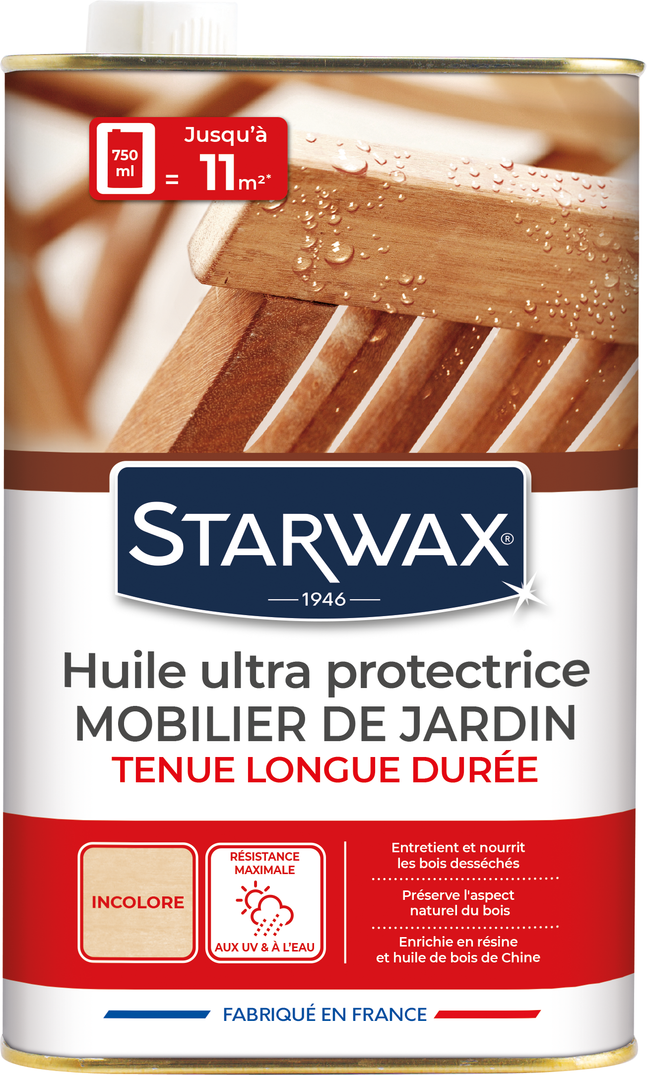 L’ Huile très longue protection pour mobilier de jardin en teck et bois exotique nourrit et embellit le mobilier de jardin en bois exotiques (teck, ipé, eucalyptus, bambou…) ou bois européens (acacia, robinier…). Elle protège sur le très long terme contre l’eau, les taches et les graisses. Barrière anti-UV, il bloque le grisaillement dû au soleil. Enrichie en huile de bois de Chine, elle renforce l’imperméabilité du bois. Elle préserve l’aspect mat et authentique de votre mobilier en bois.