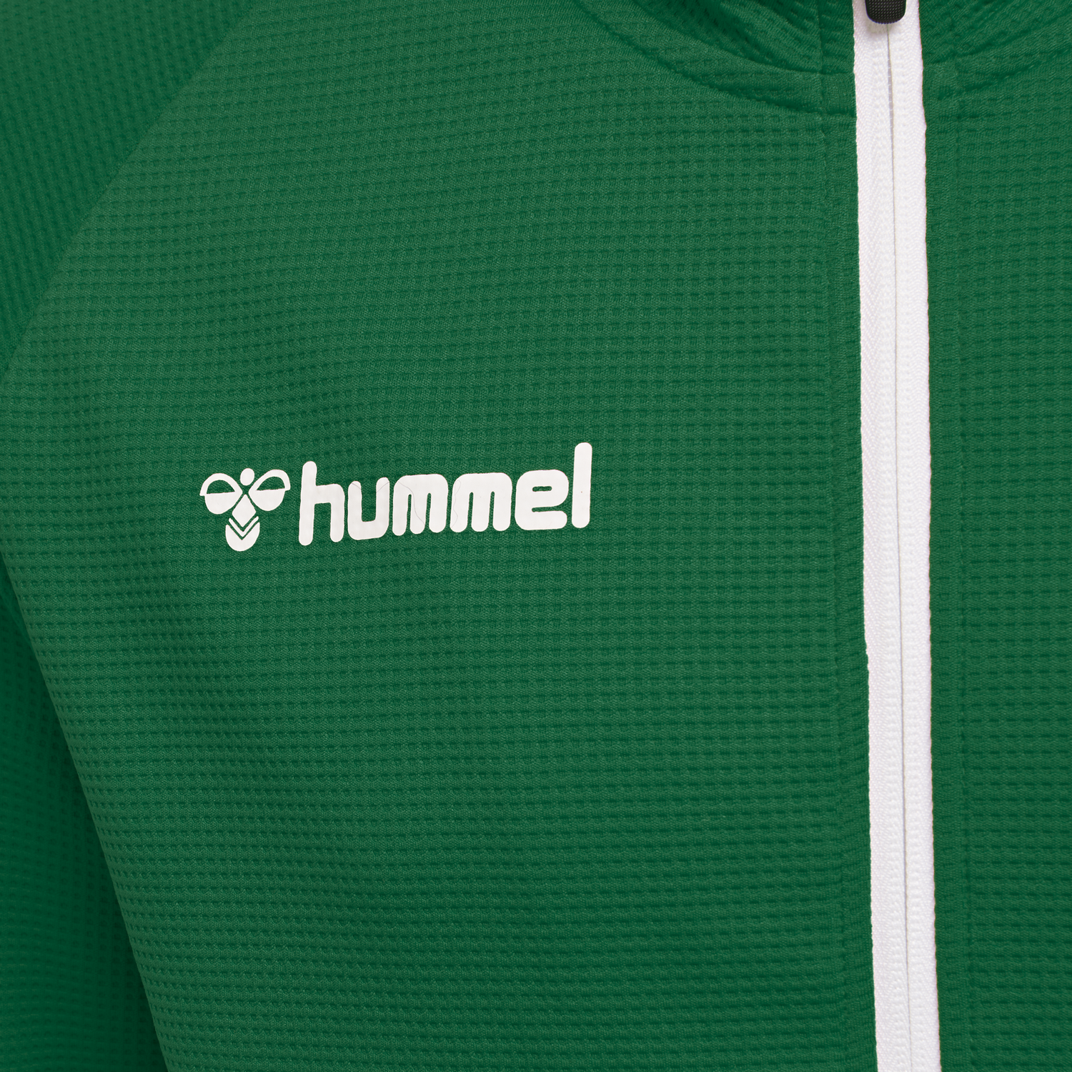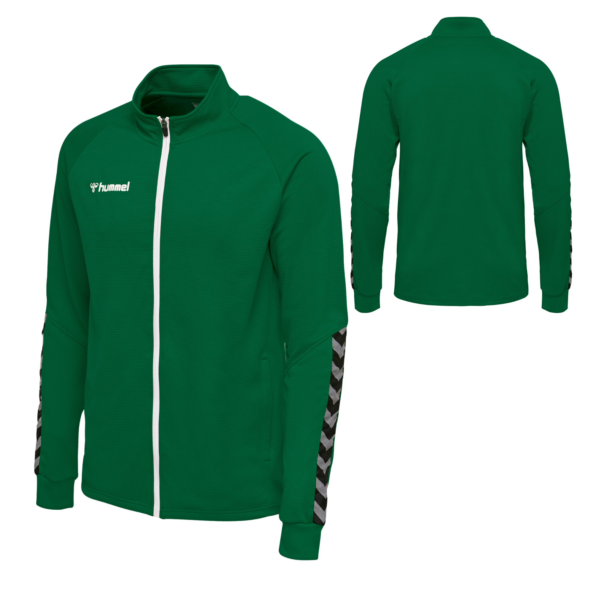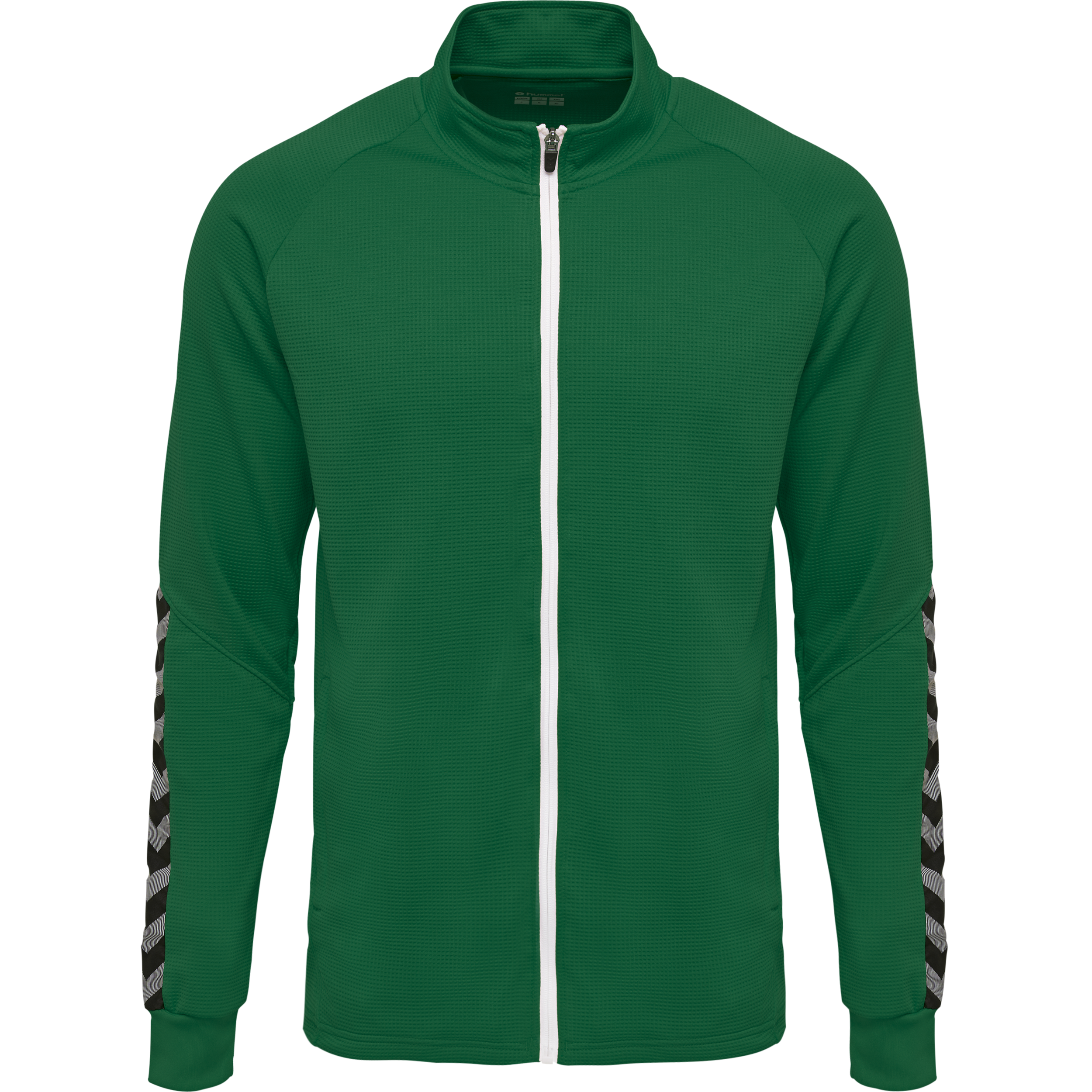 HUMMEL Veste HMLAUTHENTIC POLY ZIP JACKET Evergreen Veste 100% PES ‘’structuré, fermeture principale zippée 2 poches zippées sur avant de la veste Finition bouts de manche RIB Bord Cote Bande Chevrons tissée Logo Hummel en print, avec encre à base d’eau Coupe Classique