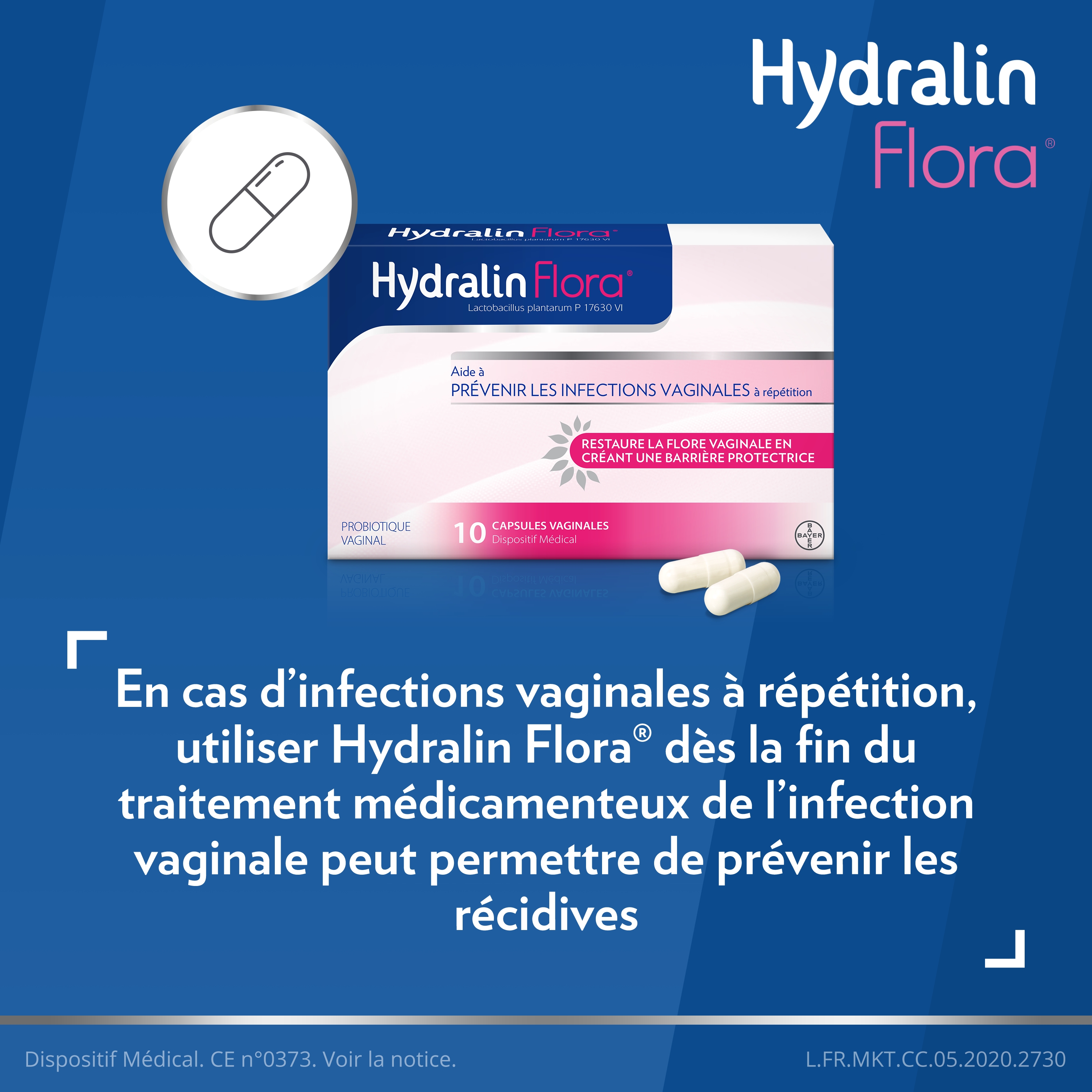 Hydralin Flora® est destiné aux femmes sujettes à des infections vaginales à répétition et qui en ont assez de multiplier les traitements ! À la suite d’un déséquilibre de la flore intime, Hydralin Flora® apporte des lactobacilles en quantité importante pour recréer une véritable barrière au niveau de la muqueuse vaginale. En cas d’infections vaginales à répétition, utiliser Hydralin Flora® dès la fin du traitement médicamenteux de l’infection vaginale (c’est-à-dire le lendemain de la dernière prise) permet de prévenir les récidives. La flore vaginale est restaurée et protège de nouveau contre les mauvais germes et les risques de récidive d’infections vaginales.