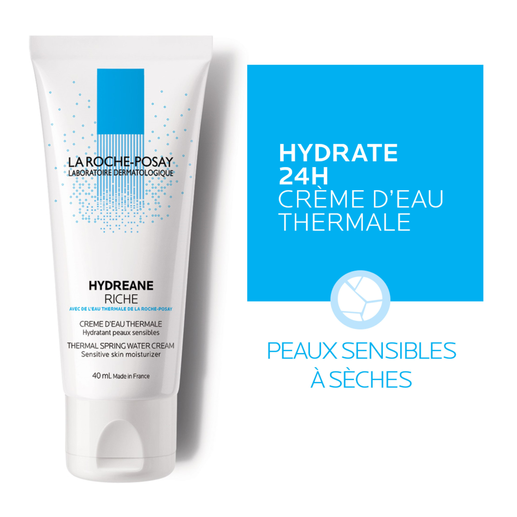 La Roche-Posay Hydreane Riche Chaque jour, offrez un verre d'Eau Thermale de la Roche-Posay à votre peau. Toutes ses vertus dans un soin hydratant : parfaitement hydratée, la peau retrouve confort et souplesse. Convient aux peaux sensibles sèches à très sèches Peaux sensibles et sèches hydratées et teint frais pour 24 heures.