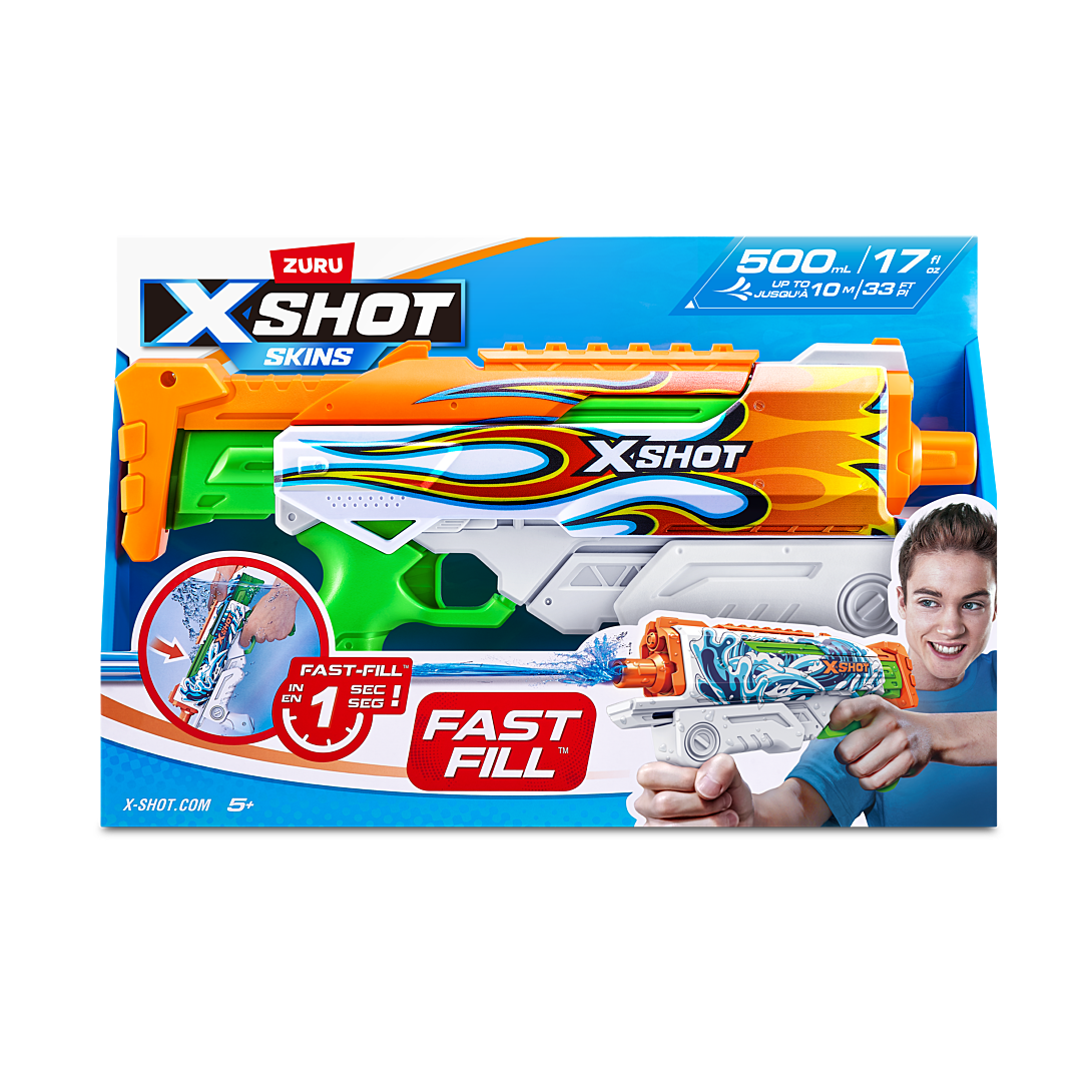 Fais en sorte que l’été te ressemble grâce à la nouvelle gamme XSHOT Water Fast-Fill Skins ! Le XSHOT Fast-Fill Hyperload à remplissage rapide et méga capacité te permet de remplir ton pistolet à eau en une seconde seulement et de reprendre le combat bien avant tes adversaires. Il te suffit de le plonger dans l'eau, le remplir et le fermer grâce à la technologie de fermeture rapide. Il tire jusqu’à 10 mètres et son réservoir contient 500 ml d’eau !