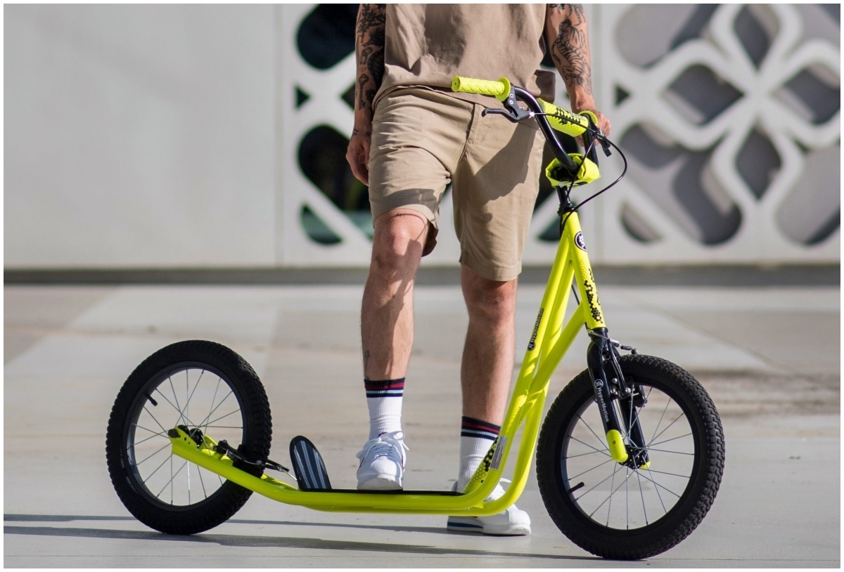 | Libellé | HyperMotion Trottinette RUNKIE Roues gonflées 16" Charge 100 KG Cadre & Fourche en Acier 2 FREINS Réglage Guidon jusqu'à 100CM Jaune |
