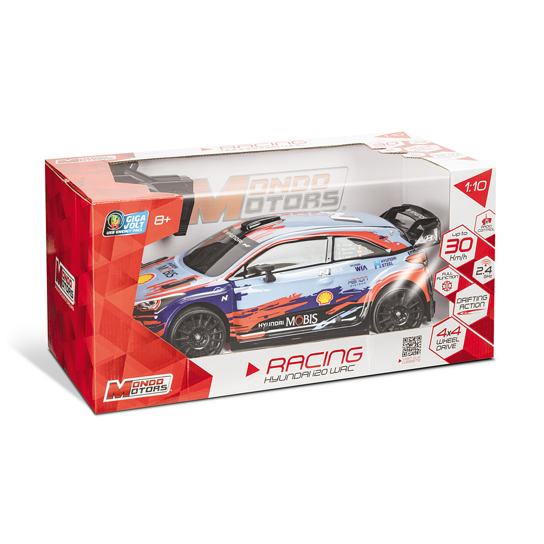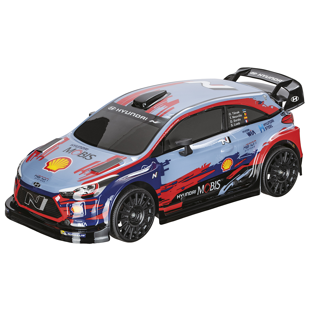Hyundai i20 WRC radiocommandée. Échelle 1:10ème (42cm), toutes directions (Av/Arr/G/D), 2,4GHz, 4 roues motrices, 30 km/h, prêt à rouler (batterie rechargeable + pile incluses), lexan body.