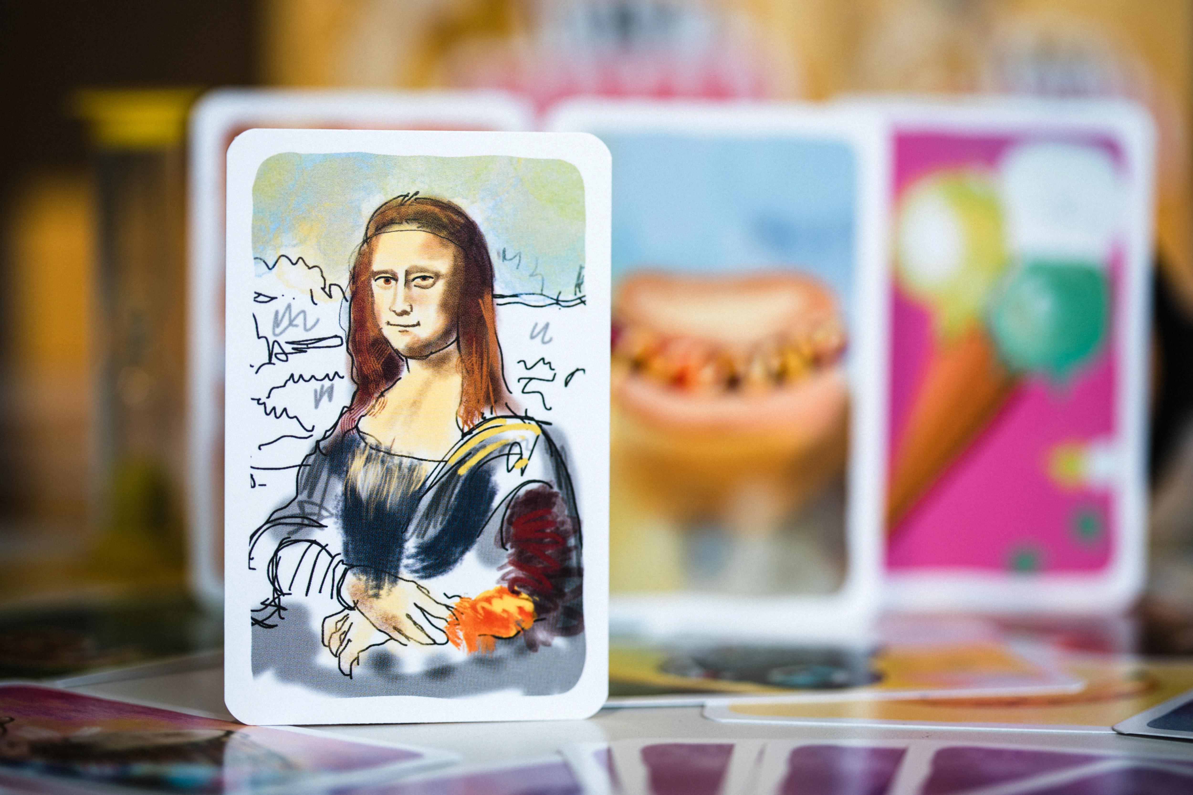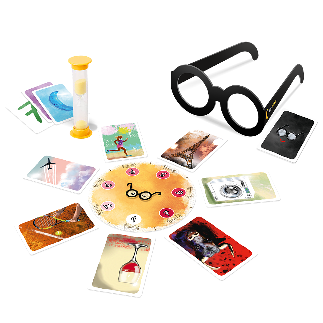 | La boîte contient | 120 cartes, 114 dessins originaux, 1 paire de lunettes, 1 plateau rond, 1 sablier jaune, 1 règle illustrée |