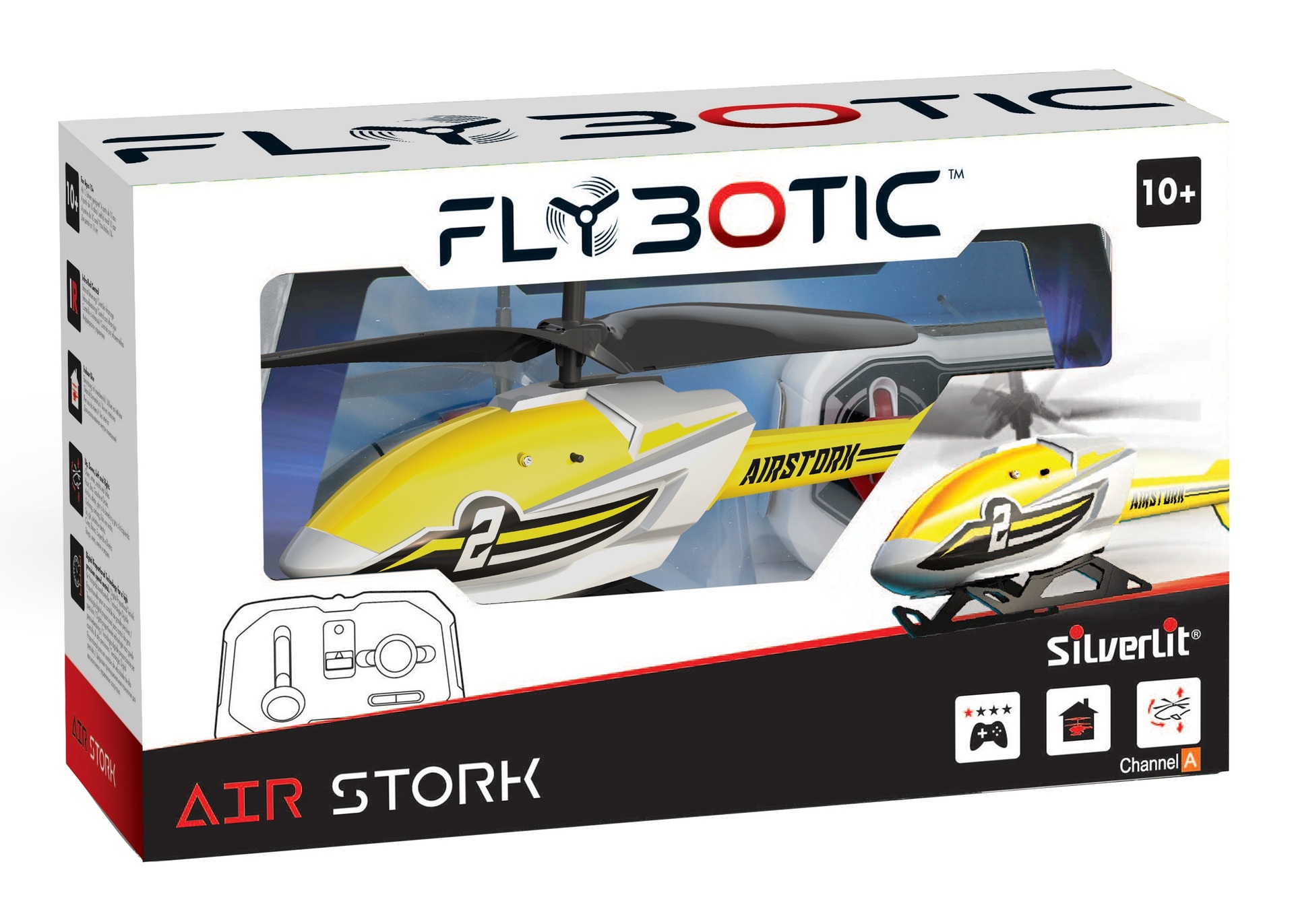 FLYBOTIC - Hélicoptère télécommandé Air Stork - Cet hélicoptère dispose de 2 canaux de contrôle : il peut monter/descendre et tourner sur lui-même. C'est un hélicoptère télécommandé qui s'utilise en intérieur. Idéal pour les enfants, il est facile à prendre en main et très stable. Il est disponible en 2 coloris : jaune ou bleu.