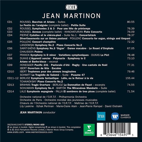 2016 marquera le 40e anniversaire de la disparition de Jean Martinon. Ce coffret de 14 CD met l'accent sur les années 1968 à 1975 à la tête de l'Orchestre National de l'O.R.T.F. et sur un répertoire essentiellement français (Berlioz, Dukas, Lalo, Chausson, Roussel, Honegger, Franck, Ibert...) qui complètent magnifiquement ses fameux enregistrements de Ravel et Debussy. Ces enregistrements provenant des fonds EMI et ERATO incluent également des enregistrements live de l'INA des années 70 : Roussel / Symphonie no 3, Bartok/ le Mandarin merveilleux et Falla/Tricorne. Un coffret qui est un hymne à la musique française par un de ses plus grands interprètes.