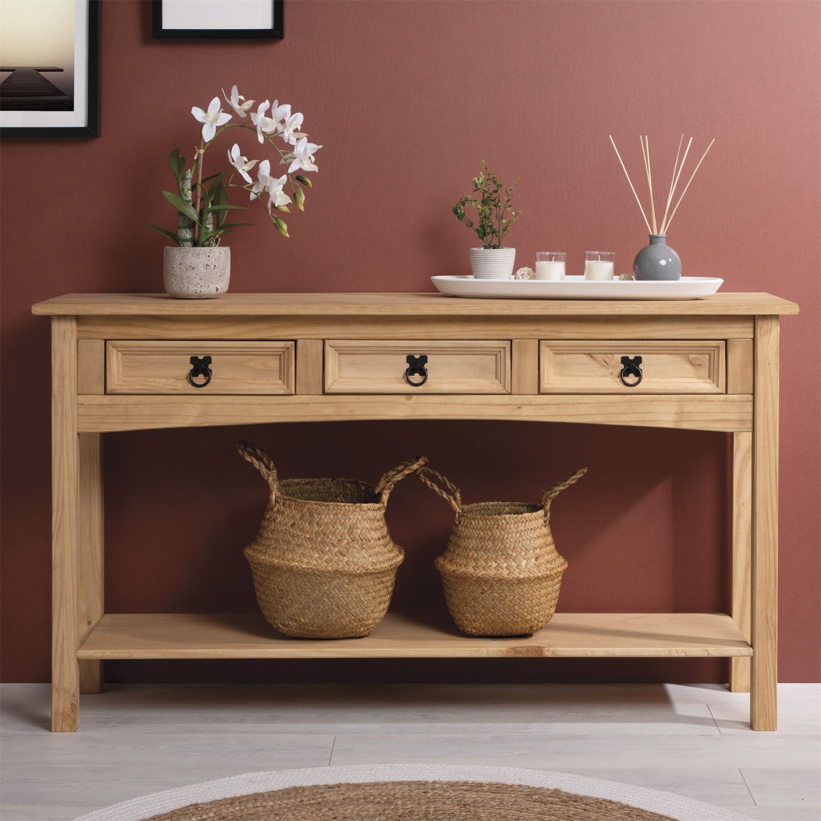 ... est une table d'appoint en bois qui vous charmera à coup sûr. Cette table console au style mexicain, à la fois rustique et intemporelle, est idéale pour meubler un coin de votre salon ou de votre entrée. Ses 3 tiroirs vous permettent de ranger vos affaires à l'abri et le plateau supérieur vous laisse assez d'espace pour y déposer divers objets de décoration. La tablette inférieure peut également accueillir quelques accessoires décoratifs, tels que des vases, des bougies ou même une plante verte. Ce meuble de rangement en pin massif trouvera facilement sa place dans votre intérieur quel que soit votre décoration, n'hésitez pas à compléter votre mobilier avec les autres meubles de la gamme SALSA !
