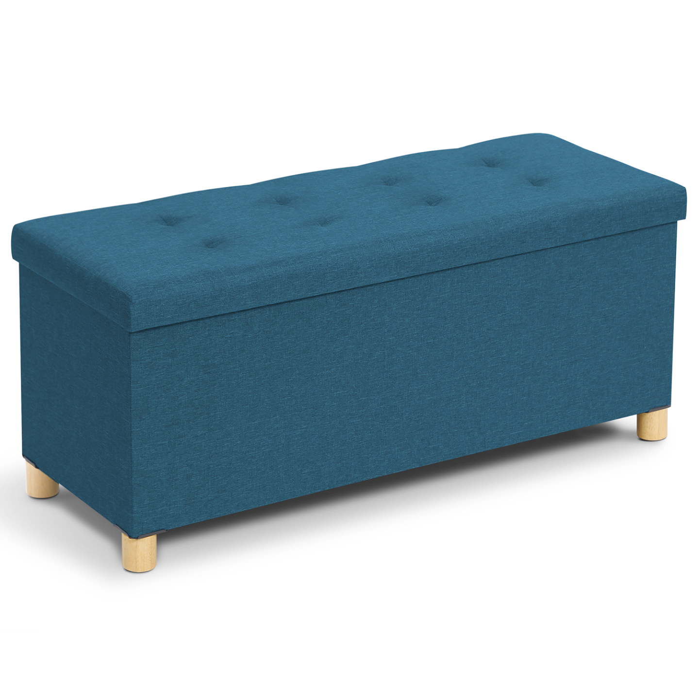 Vous pouvez dès à présent ranger efficacement tous vos vêtements, chaussures, plaids, jouets, DVD, livres ou tout autre objet grâce à notre banc coffre 100 cm en tissu bleu canard. Avec sa maxi capacité de rangement, fini les affaires qui traînent ! Gardez vos objets discrètement rangés, organisés, à l'abri de la poussière, et à portée de main !Doté de belles finitions, son couvercle, joliment capitonné, en tissu lin bleu canard élégant et moderne, lui confère un design chic et charme. En plus d'être agréable au toucher, sa surface rembourrée en fait une assise d'appoint confortable.Pratique, esthétique, et discret, ce banc coffre s'adaptera idéalement à tout type d'intérieur ! Il donnera du peps et de la couleur à votre pièce de vie tout en lui apportant une petite touche scandinave !Surélevé sur de petits pieds en bois d'hévéa de 5 cm de hauteur, en MDF, il est stable et robuste. Avec son poids léger, il est facilement transportable. Vous pourrez aisément passer la toile sous votre banc coffre de rangement.Véritable solution de rangement et élément de décoration, installez-le où bon vous semble : dans votre chambre comme bout de lit, dans votre dressing, dans votre vestibule contre un mur comme meuble d'entrée, dans une salle de jeux, ou tout simplement dans votre salon.Astucieux, il ne prend pas de place ! Vous n'avez plus qu'à y poser un plaid ou de petits coussins colorés à motifs géométriques pour parfaire la décoration et le confort de votre pièce! Dimensions et composition du banc coffre sur pieds 100 cmDimensions globales hors-tout : Longueur 100 cm x largeur 38 cm x Hauteur 43 cmHauteur des pieds : 5 cmÉpaisseur de l'assise : 2,5 cmRevêtement extérieur : lin teinté bleu canard avec capitons sur le haut du coffreRevêtement à l'intérieur du coffre : doublure noire non-tissé 80 grammesRembourrage en polyesterStructure en MDFPieds en bois d'hévéaÀ monter soi-mêmeRetrouvez l'ensemble de nos coffres de rangement sur notre boutique en ligne !